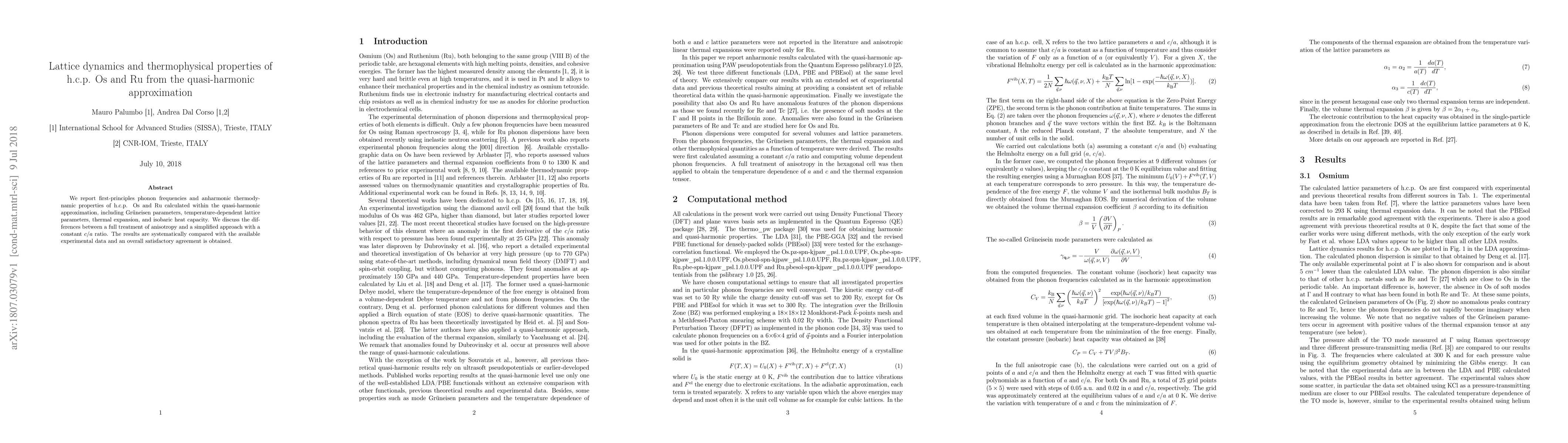 This study uses first-principles calculations to determine phonon frequencies and anharmonic thermodynamic properties of h.c.p. Os and Ru, focusing on lattice dynamics and thermophysical properties via the quasi-harmonic approximation. The research compares full anisotropic treatment with simplified models and finds satisfactory agreement with experimental data.