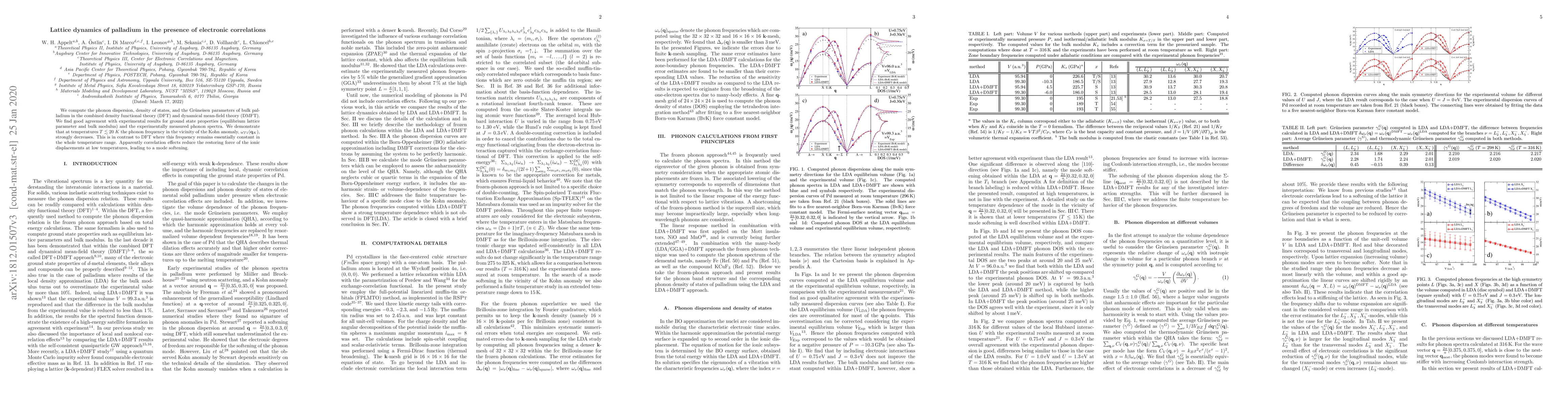 We compute the phonon dispersion, density of states, and the Gr\"uneisen parameters of bulk palladium in the combined density functional theory (DFT) and dynamical mean-field theory (DMFT). We find good agreement with experimental results for ground state properties (equilibrium lattice parameter and bulk modulus) and the experimentally measured phonon spectra. We demonstrate that at temperatures $T \lesssim 20~K$ the phonon frequency in the vicinity of the Kohn anomaly, $\omega_{T1}({\bf q}_{K})$, strongly decreases. This is in contrast to DFT where this frequency remains essentially constant in the whole temperature range. Apparently correlation effects reduce the restoring force of the ionic displacements at low temperatures, leading to a mode softening.
