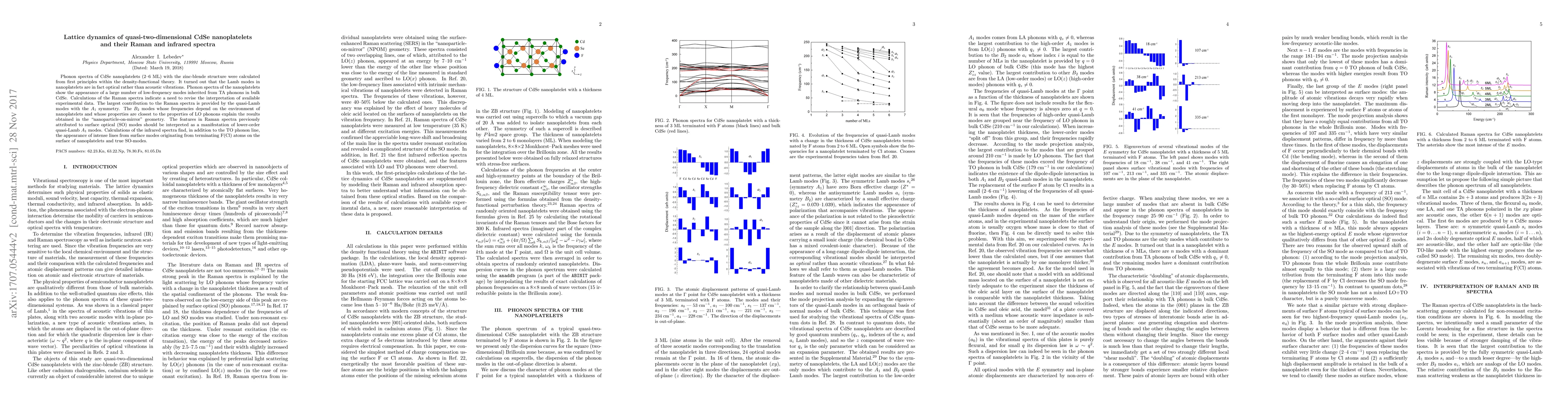 Phonon spectra of CdSe nanoplatelets (2-6 ML) with the zinc-blende structure were calculated from first principles within the density-functional theory. It turned out that the Lamb modes in nanoplatelets are in fact optical rather than acoustic vibrations. Phonon spectra of the nanoplatelets show the appearance of a large number of low-frequency modes inherited from TA phonons in bulk CdSe. Calculations of the Raman spectra indicate a need to revise the interpretation of available experimental data. The largest contribution to the Raman spectra is provided by the quasi-Lamb modes with the $A_1$ symmetry. The $B_2$ modes whose frequencies depend on the environment of nanoplatelets and whose properties are closest to the properties of LO phonons explain the results obtained in the "nanoparticle-on-mirror" geometry. The features in Raman spectra previously attributed to surface optical (SO) modes should be interpreted as a manifestation of lower-order quasi-Lamb $A_1$ modes. Calculations of the infrared spectra find, in addition to the TO phonon line, the appearance of intense lines from surface modes originating from terminating F(Cl) atoms on the surface of nanoplatelets and true SO-modes.