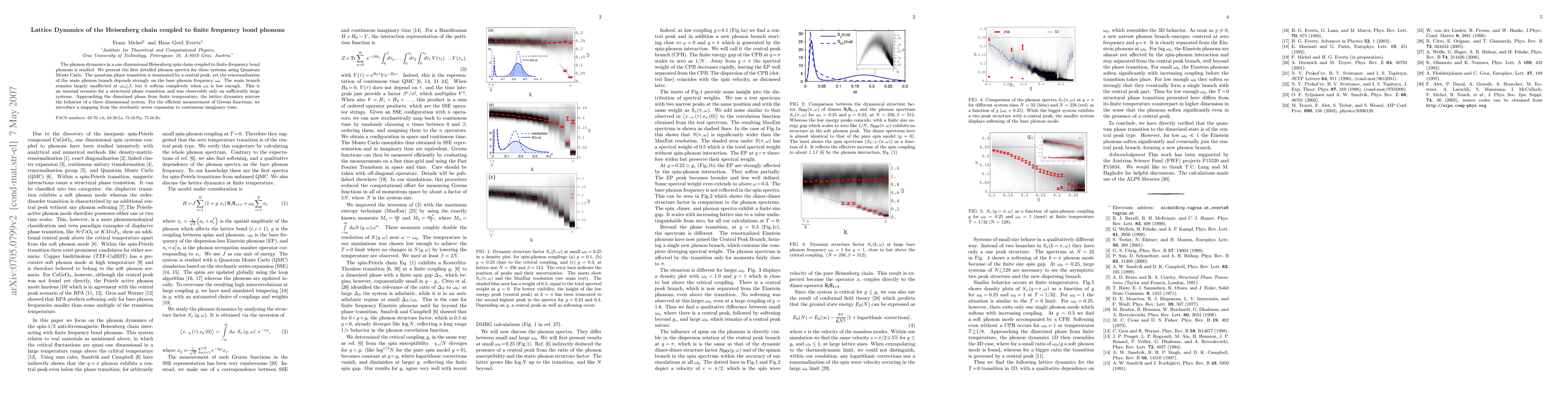 This paper investigates the phonon dynamics in a one-dimensional Heisenberg spin chain coupled to finite-frequency bond phonons, revealing a quantum phase transition dominated by a central peak. The phonon spectra, obtained via Quantum Monte Carlo, show that the main phonon branch's renormalization is strongly dependent on the phonon frequency, softening significantly when the frequency is low, which is unusual for structural phase transitions.