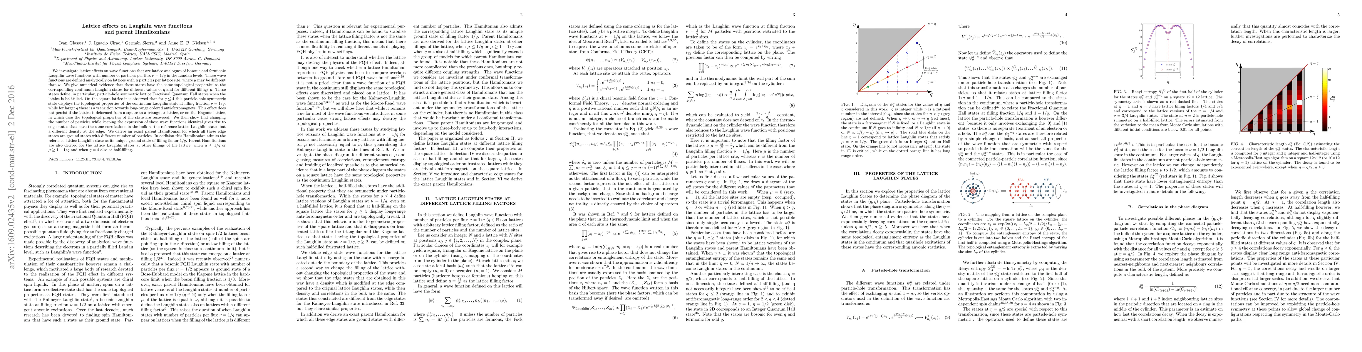 We investigate lattice effects on wave functions that are lattice analogues of bosonic and fermionic Laughlin wave functions with number of particles per flux $\nu=1/q$ in the Landau levels. These wave functions are defined analytically on lattices with $\mu$ particles per lattice site, where $\mu$ may be different than $\nu$. We give numerical evidence that these states have the same topological properties as the corresponding continuum Laughlin states for different values of $q$ and for different fillings $\mu$. These states define, in particular, particle-hole symmetric lattice Fractional Quantum Hall states when the lattice is half-filled. On the square lattice it is observed that for $q\leq 4$ this particle-hole symmetric state displays the topological properties of the continuum Laughlin state at filling fraction $\nu=1/q$, while for larger $q$ there is a transition towards long-range ordered anti-ferromagnets. This effect does not persist if the lattice is deformed from a square to a triangular lattice, or on the Kagome lattice, in which case the topological properties of the state are recovered. We then show that changing the number of particles while keeping the expression of these wave functions identical gives rise to edge states that have the same correlations in the bulk as the reference lattice Laughlin states but a different density at the edge. We derive an exact parent Hamiltonian for which all these edge states are ground states with different number of particles. In addition this Hamiltonian admits the reference lattice Laughlin state as its unique ground state of filling factor $1/q$. Parent Hamiltonians are also derived for the lattice Laughlin states at other fillings of the lattice, when $\mu\leq 1/q$ or $\mu\geq 1-1/q$ and when $q=4$ also at half-filling.