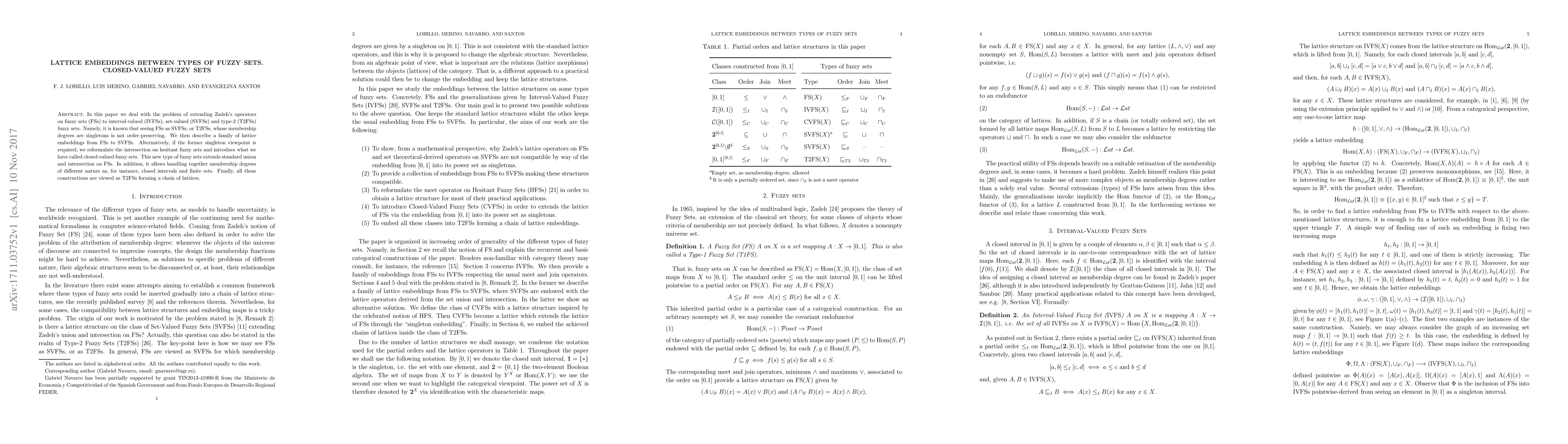 This paper extends Zadeh's operators to interval-valued, set-valued, and type-2 fuzzy sets, introducing lattice embeddings from standard fuzzy sets to set-valued fuzzy sets. It also proposes closed-valued fuzzy sets to handle different membership degrees, forming a chain of lattices with type-2 fuzzy sets.