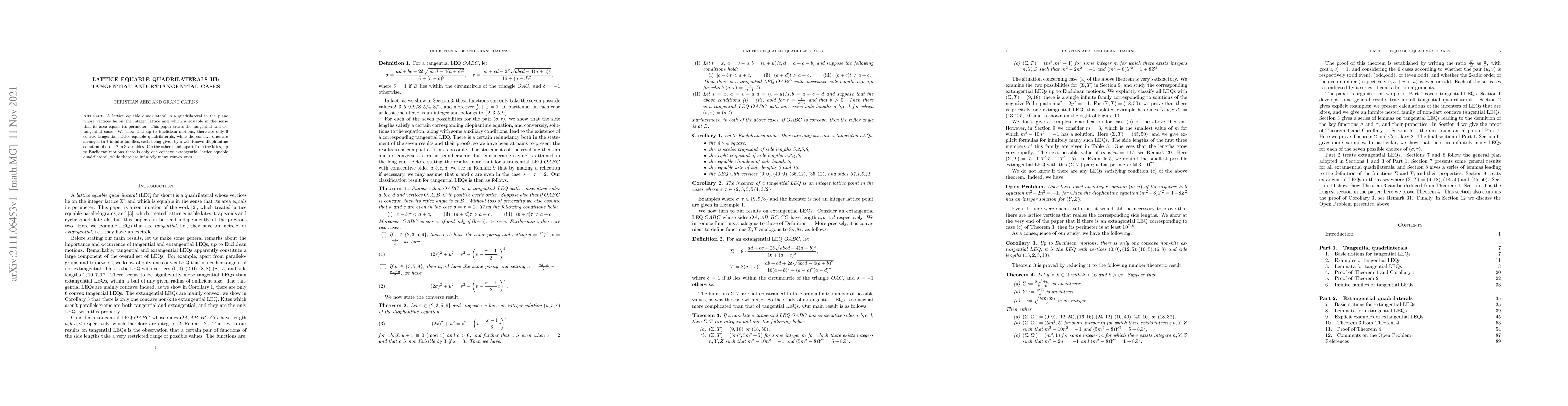 This paper investigates lattice equable quadrilaterals where vertices lie on the integer lattice and area equals perimeter. It identifies six convex tangential and seven infinite families of concave tangential lattice equable quadrilaterals. For extangential cases, there is one concave and infinitely many convex quadrilaterals.