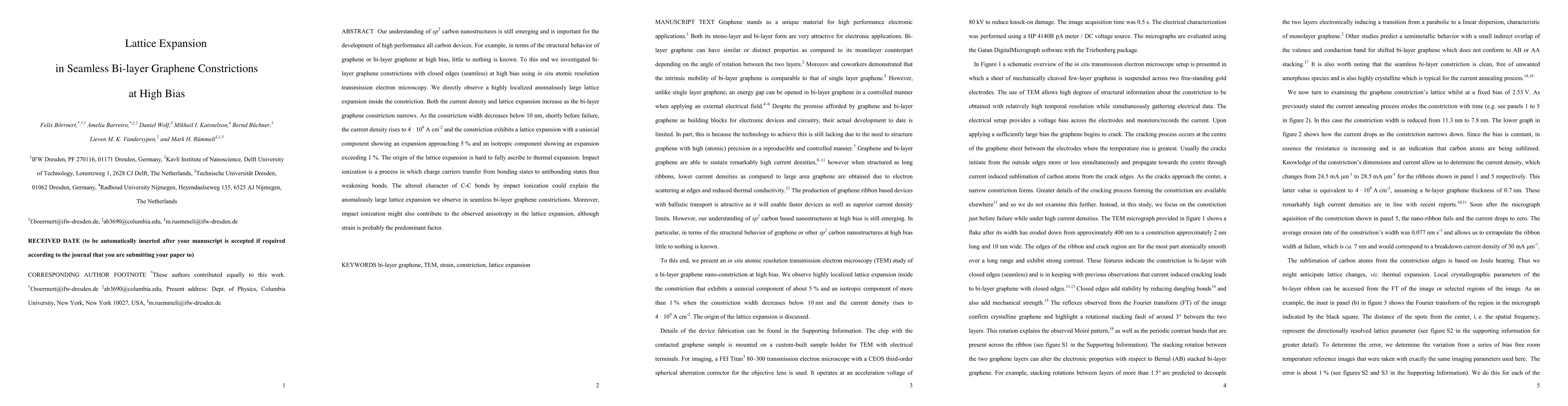 Our understanding of sp2 carbon nanostructures is still emerging and is important for the development of high performance all carbon devices. For example, in terms of the structural behavior of graphene or bi-layer graphene at high bias, little to nothing is known. To this end we investigated bi-layer graphene constrictions with closed edges (seamless) at high bias using in situ atomic resolution transmission electron microscopy. We directly observe a highly localized anomalously large lattice expansion inside the constriction. Both the current density and lattice expansion increase as the bi-layer graphene constriction narrows. As the constriction width decreases below 10 nm, shortly before failure, the current density rises to 4 \cdot 109 A cm-2 and the constriction exhibits a lattice expansion with a uniaxial component showing an expansion approaching 5 % and an isotropic component showing an expansion exceeding 1 %. The origin of the lattice expansion is hard to fully ascribe to thermal expansion. Impact ionization is a process in which charge carriers transfer from bonding states to antibonding states thus weakening bonds. The altered character of C-C bonds by impact ionization could explain the anomalously large lattice expansion we observe in seamless bi-layer graphene constrictions. Moreover, impact ionization might also contribute to the observed anisotropy in the lattice expansion, although strain is probably the predominant factor.