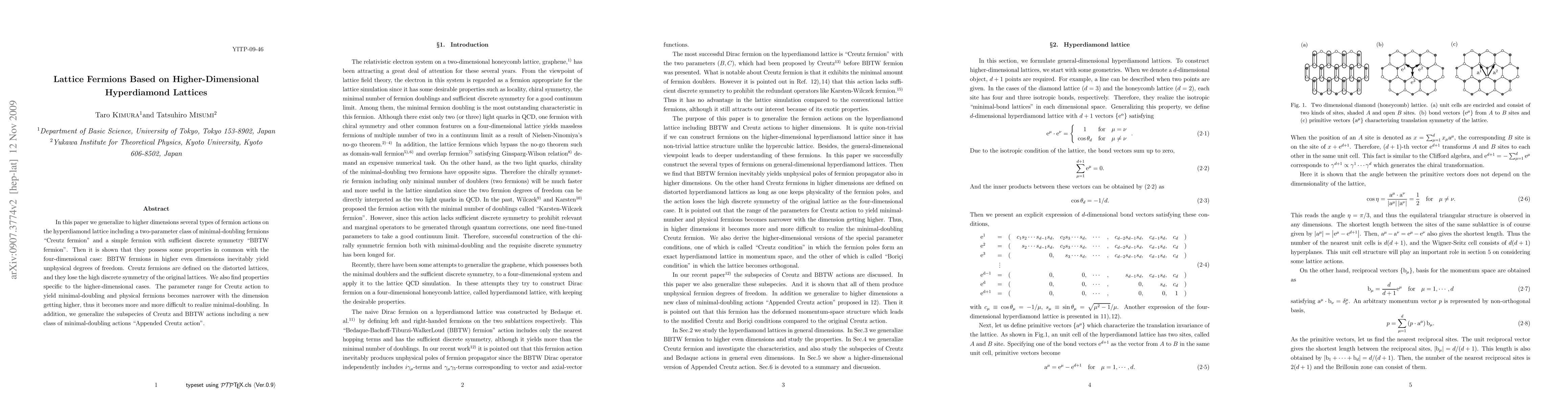 In this paper we generalize to higher dimensions several types of fermion actions on the hyperdiamond lattice including a two-parameter class of minimal-doubling fermions "Creutz fermion" and a simple fermion with sufficient discrete symmetry "BBTW fermion". Then it is shown that they possess some properties in common with the four-dimensional case: BBTW fermions in higher even dimensions inevitably yield unphysical degrees of freedom. Creutz fermions are defined on the distorted lattices, and they lose the high discrete symmetry of the original lattices. We also find properties specific to the higher-dimensional cases. The parameter range for Creutz action to yield minimal-doubling and physical fermions becomes narrower with the dimension getting higher, thus it becomes more and more difficult to realize minimal-doubling. In addition, we generalize the subspecies of Creutz and BBTW actions including a new class of minimal-doubling actions "Appended Creutz action".