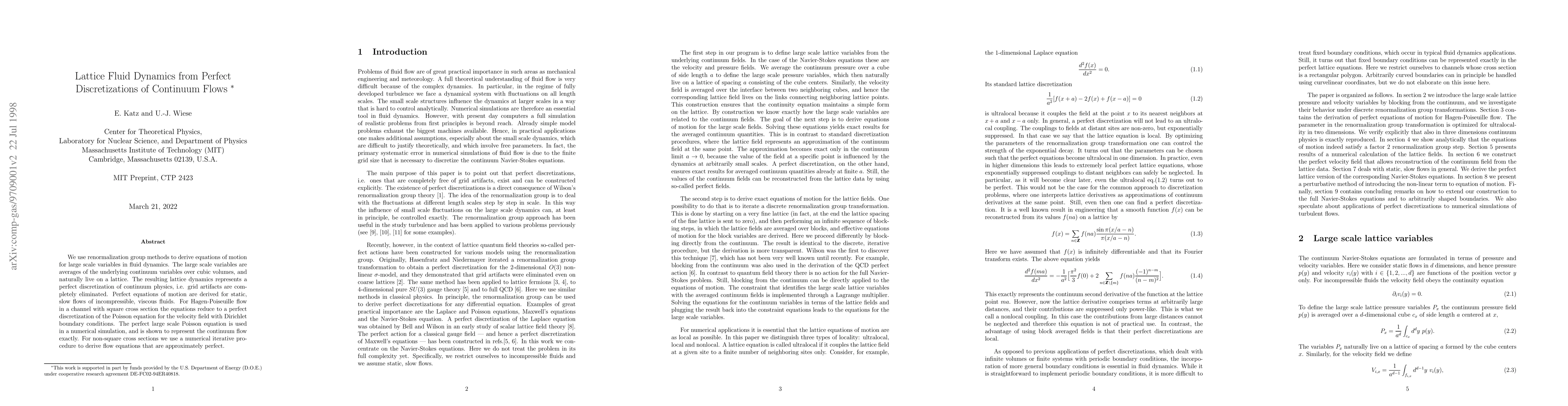 We use renormalization group methods to derive equations of motion for large scale variables in fluid dynamics. The large scale variables are averages of the underlying continuum variables over cubic volumes, and naturally live on a lattice. The resulting lattice dynamics represents a perfect discretization of continuum physics, i.e. grid artifacts are completely eliminated. Perfect equations of motion are derived for static, slow flows of incompressible, viscous fluids. For Hagen-Poiseuille flow in a channel with square cross section the equations reduce to a perfect discretization of the Poisson equation for the velocity field with Dirichlet boundary conditions. The perfect large scale Poisson equation is used in a numerical simulation, and is shown to represent the continuum flow exactly. For non-square cross sections we use a numerical iterative procedure to derive flow equations that are approximately perfect.