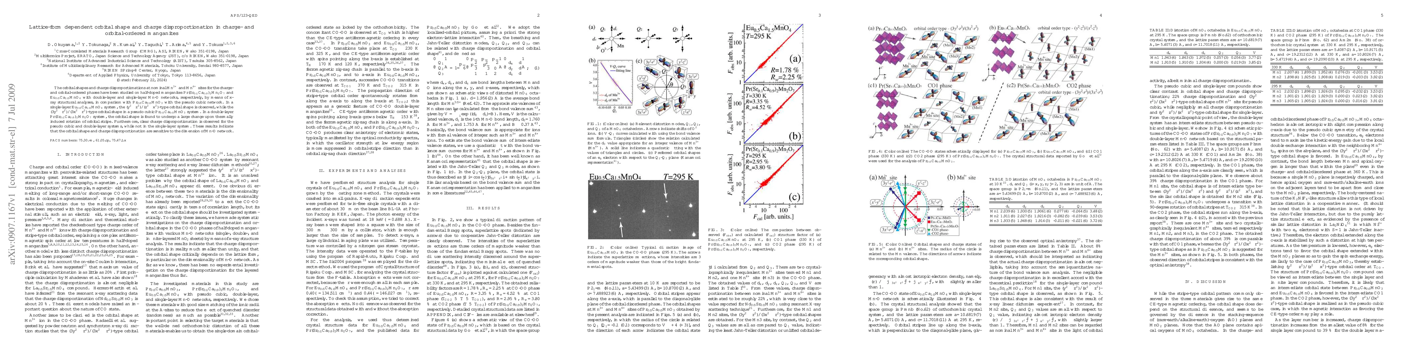 This study investigates the orbital shapes and charge disproportionations in charge- and orbital-ordered manganites, revealing that the ($y^2-z^2$)/($z^2-x^2$)-type orbital shape occurs in single-layer systems, while the ($3y^2-r^2$)/($3x^2-r^2$)-type shape is found in pseudo cubic networks. Charge disproportionation is evident in pseudo cubic and double-layer systems but absent in single-layer systems, indicating sensitivity to the Mn-O network dimension.