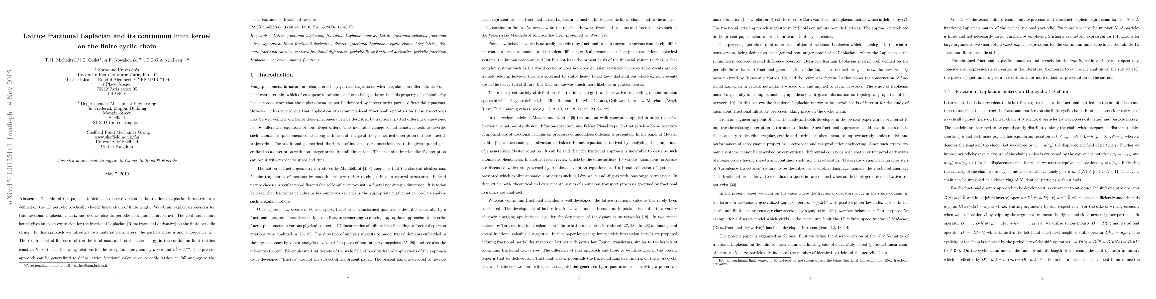 This paper derives a discrete fractional Laplacian matrix on a finite cyclic chain and finds its continuum limit kernel, introducing material parameters $\mu$ and $\Omega_\alpha$ that scale with lattice constant $h$. The continuum limit provides an exact expression for the fractional Laplacian on the finite periodic string.