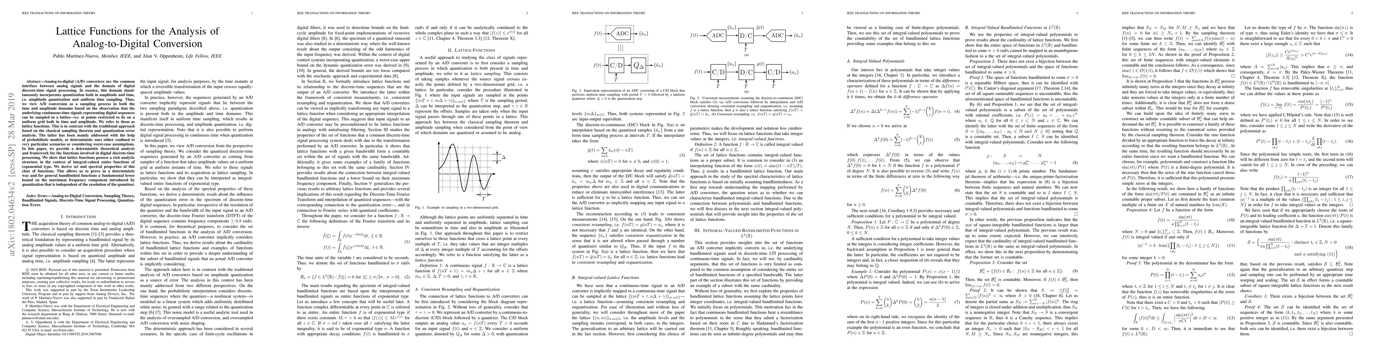 Analog-to-digital (A/D) converters are the common interface between analog signals and the domain of digital discrete-time signal processing. In essence, this domain simultaneously incorporates quantization both in amplitude and time, i.e. amplitude quantization and uniform time sampling. Thus, we view A/D conversion as a sampling process in both the time and amplitude domains based on the observation that the underlying continuous-time signals representing digital sequences can be sampled in a lattice---i.e. at points restricted to lie on a uniform grid both in time and amplitude. We refer to them as lattice functions. This is in contrast with the traditional approach based on the classical sampling theorem and quantization error analysis. The latter has been mainly addressed with the help of probabilistic models, or deterministic ones either confined to very particular scenarios or considering worst-case assumptions. In this paper, we provide a deterministic theoretical analysis and framework for the functions involved in digital discrete-time processing. We show that lattice functions possess a rich analytic structure in the context of integral-valued entire functions of exponential type. We derive set and spectral properties of this class of functions. This allows us to prove in a deterministic way and for general bandlimited functions a fundamental lower bound on the maximum frequency component introduced by quantization that is independent of the resolution of the quantizer.