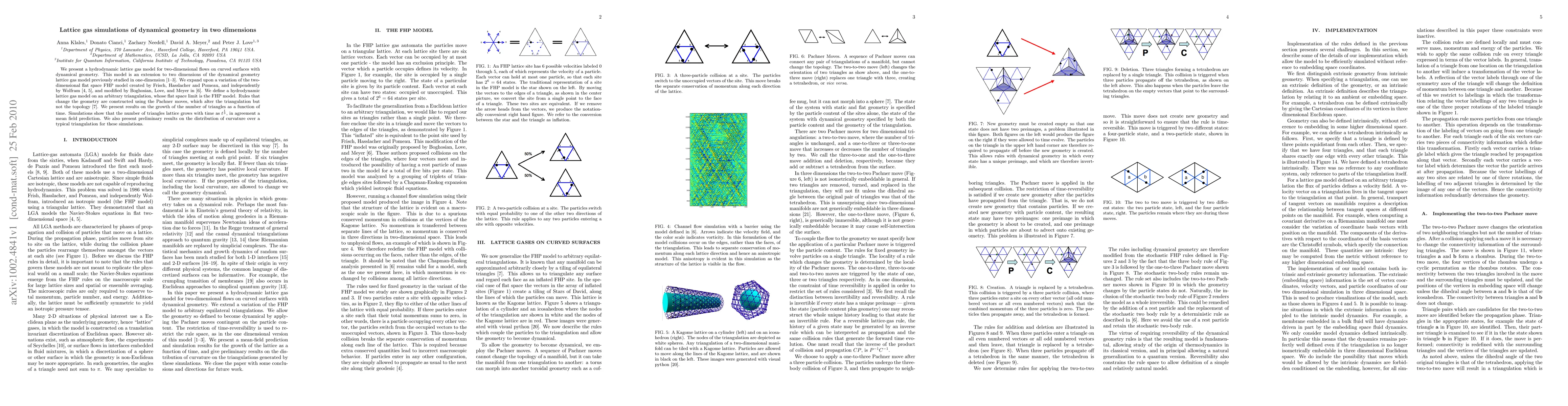 We present a hydrodynamic lattice gas model for two-dimensional flows on curved surfaces with dynamical geometry. This model is an extension to two dimensions of the dynamical geometry lattice gas model previously studied in one-dimension. We expand upon a variation of the two-dimensional flat space FHP model created by Frisch, Hasslacher and Pomeau, and independently by Wolfram, and modified by Boghosian, Love, and Meyer. We define a hydrodynamic lattice gas model on an arbitrary triangulation, whose flat space limit is the FHP model. Rules that change the geometry are constructed using the Pachner moves, which alter the triangulation but not the topology. We present results on the growth of the number of triangles as a function of time. Simulations show that the number of triangles lattice grows with time as the cube root of the number of time steps, in agreement a mean field prediction. We also present preliminary results on the distribution of curvature over a typical triangulation for these simulations.