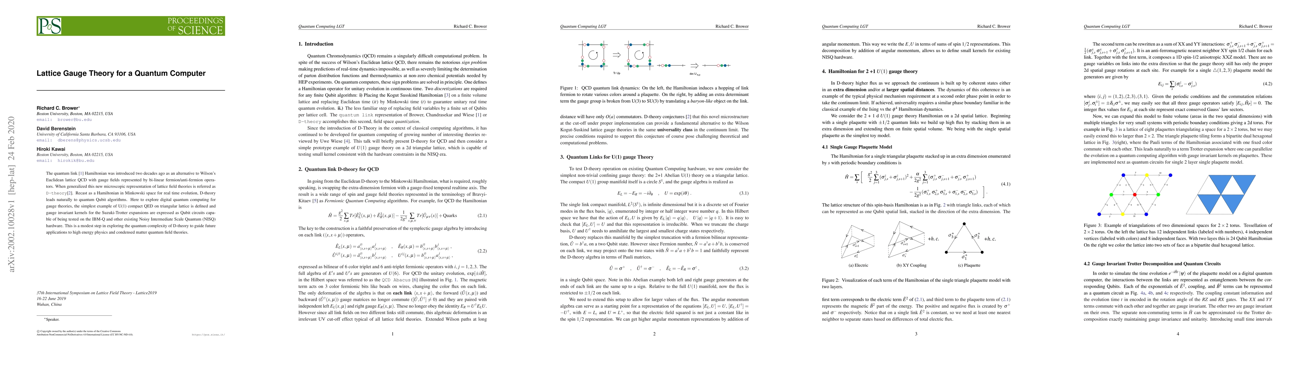 The quantum link~\cite{Brower:1997ha} Hamiltonian was introduced two decades ago as an alternative to Wilson's Euclidean lattice QCD with gauge fields represented by bi-linear fermion/anti-fermion operators. When generalized this new microscopic representation of lattice field theories is referred as {\tt D-theory}~\cite{Brower:2003vy}. Recast as a Hamiltonian in Minkowski space for real time evolution, D-theory leads naturally to quantum Qubit algorithms. Here to explore digital quantum computing for gauge theories, the simplest example of U(1) compact QED on triangular lattice is defined and gauge invariant kernels for the Suzuki-Trotter expansions are expressed as Qubit circuits capable of being tested on the IBM-Q and other existing Noisy Intermediate Scale Quantum (NISQ) hardware. This is a modest step in exploring the quantum complexity of D-theory to guide future applications to high energy physics and condensed matter quantum field theories.