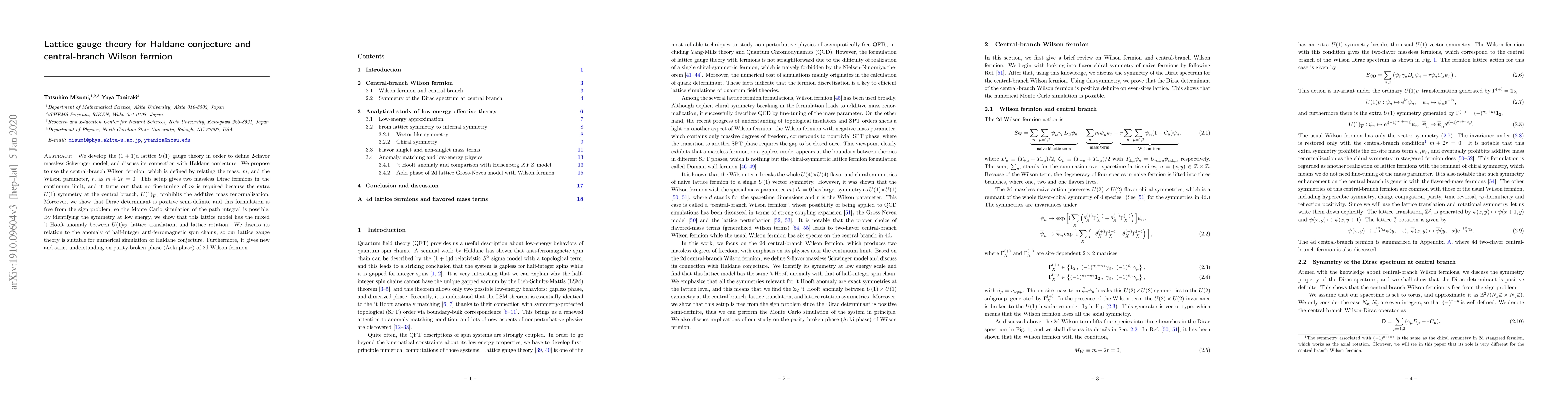 We develop the $(1+1)$d lattice $U(1)$ gauge theory in order to define $2$-flavor massless Schwinger model, and discuss its connection with Haldane conjecture. We propose to use the central-branch Wilson fermion, which is defined by relating the mass, $m$, and the Wilson parameter, $r$, as $m+2r=0$. This setup gives two massless Dirac fermions in the continuum limit, and it turns out that no fine-tuning of $m$ is required because the extra $U(1)$ symmetry at the central branch, $U(1)_{\bar{V}}$, prohibits the additive mass renormalization. Moreover, we show that Dirac determinant is positive semi-definite and this formulation is free from the sign problem, so the Monte Carlo simulation of the path integral is possible. By identifying the symmetry at low energy, we show that this lattice model has the mixed 't Hooft anomaly between $U(1)_{\bar{V}}$, lattice translation, and lattice rotation. We discuss its relation to the anomaly of half-integer anti-ferromagnetic spin chains, so our lattice gauge theory is suitable for numerical simulation of Haldane conjecture. Furthermore, it gives new and strict understanding on parity-broken phase (Aoki phase) of $2$d Wilson fermion.