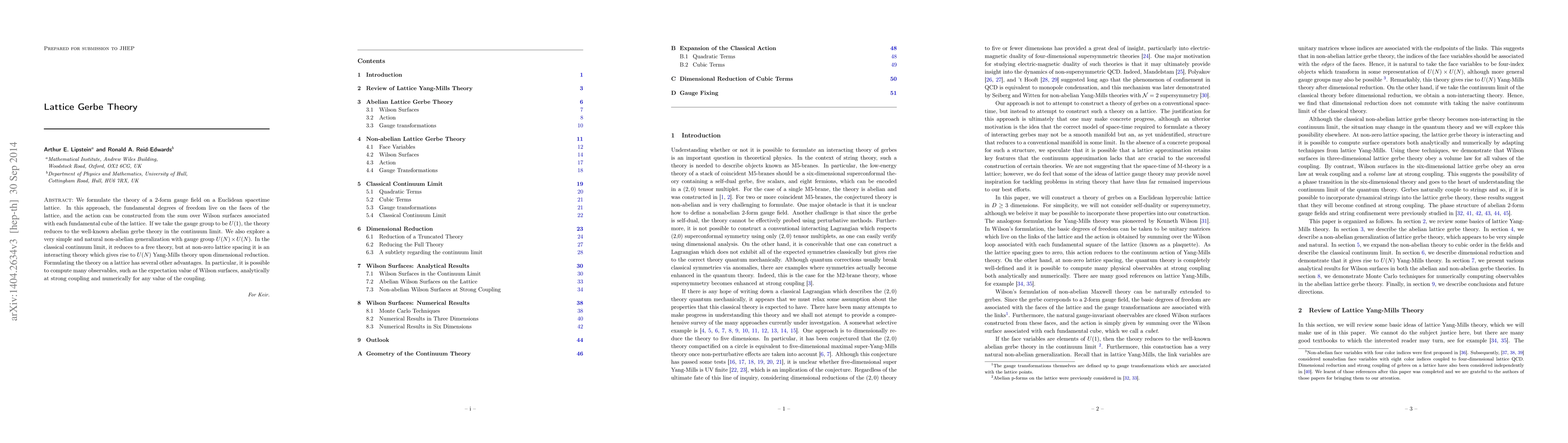 We formulate the theory of a 2-form gauge field on a Euclidean spacetime lattice. In this approach, the fundamental degrees of freedom live on the faces of the lattice, and the action can be constructed from the sum over Wilson surfaces associated with each fundamental cube of the lattice. If we take the gauge group to be $U(1)$, the theory reduces to the well-known abelian gerbe theory in the continuum limit. We also propose a very simple and natural non-abelian generalization with gauge group $U(N) \times U(N)$, which gives rise to $U(N)$ Yang-Mills theory upon dimensional reduction. Formulating the theory on a lattice has several other advantages. In particular, it is possible to compute many observables, such as the expectation value of Wilson surfaces, analytically at strong coupling and numerically for any value of the coupling.