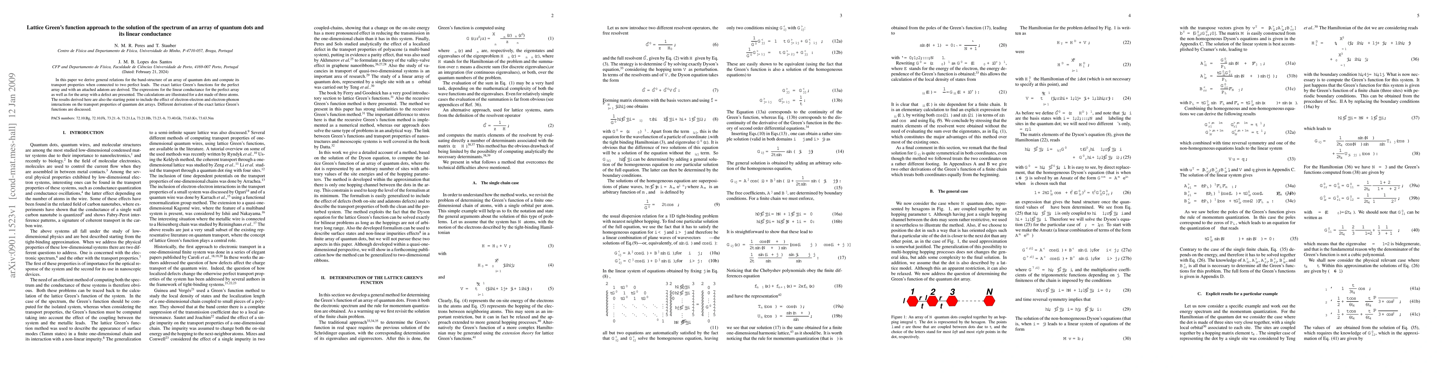 In this paper we derive general relations for the band-structure of an array of quantum dots and compute its transport properties when connected to two perfect leads. The exact lattice Green's functions for the perfect array and with an attached adatom are derived. The expressions for the linear conductance for the perfect array as well as for the array with a defect are presented. The calculations are illustrated for a dot made of three atoms. The results derived here are also the starting point to include the effect of electron-electron and electron-phonon interactions on the transport properties of quantum dot arrays. Different derivations of the exact lattice Green's functions are discussed.
