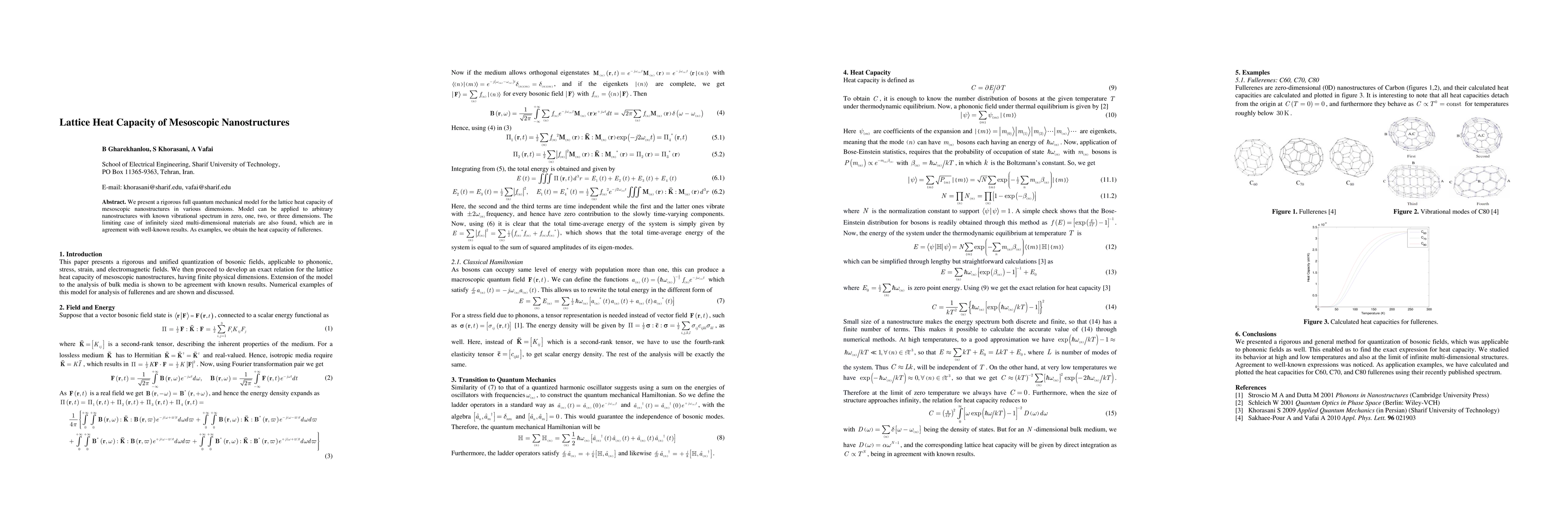 This paper develops a comprehensive quantum mechanical model for calculating the lattice heat capacity of mesoscopic nanostructures across different dimensions, and applies it to fullerenes, demonstrating agreement with established results for infinite-sized materials.