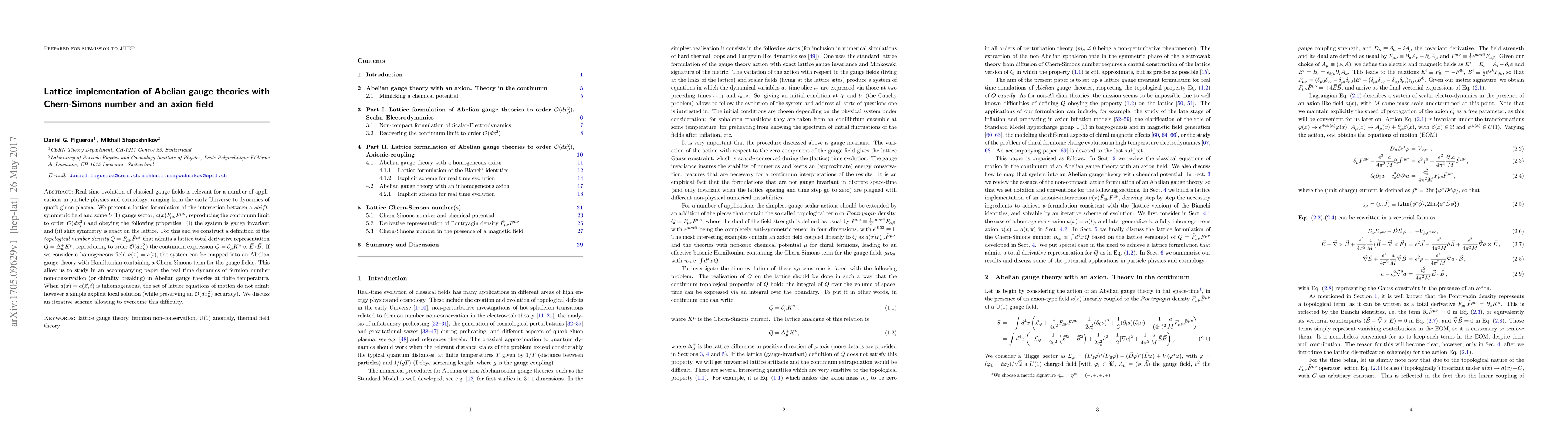 This research presents a lattice formulation for the interaction between a shift-symmetric field and U(1) gauge fields, preserving gauge invariance and exact shift symmetry. It defines a topological number density Q with a lattice total derivative representation, reproducing continuum expressions. For homogeneous fields, it maps the system into an Abelian gauge theory with a Chern-Simons term, enabling the study of real-time fermion number non-conservation. For inhomogeneous fields, an iterative scheme is proposed to overcome solution difficulties, maintaining O(dx_μ^2) accuracy.