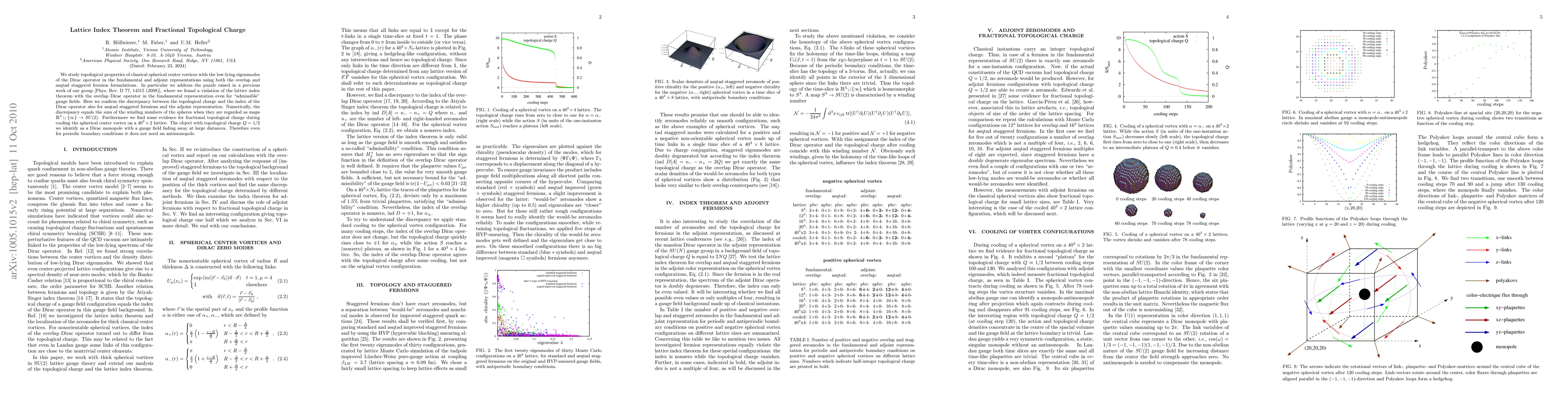 We study topological properties of classical spherical center vortices with the low-lying eigenmodes of the Dirac operator in the fundamental and adjoint representations using both the overlap and asqtad staggered fermion formulations. In particular we address the puzzle raised in a previous work of our group [Phys.\ Rev.\ D 77, 14515 (2008)], where we found a violation of the lattice index theorem with the overlap Dirac operator in the fundamental representation even for "admissible" gauge fields. Here we confirm the discrepancy between the topological charge and the index of the Dirac operator also for asqtad staggered fermions and the adjoint representation. Numerically, the discrepancy equals the sum of the winding numbers of the spheres when they are regarded as maps $\mathbbm R^3 \cup \{\infty\} \to SU(2)$. Furthermore we find some evidence for fractional topological charge during cooling the spherical center vortex on a $40^3 \times 2$ lattice. The object with topological charge $Q=1/2$ we identify as a Dirac monopole with a gauge field fading away at large distances. Therefore even for periodic boundary conditions it does not need an antimonopole.