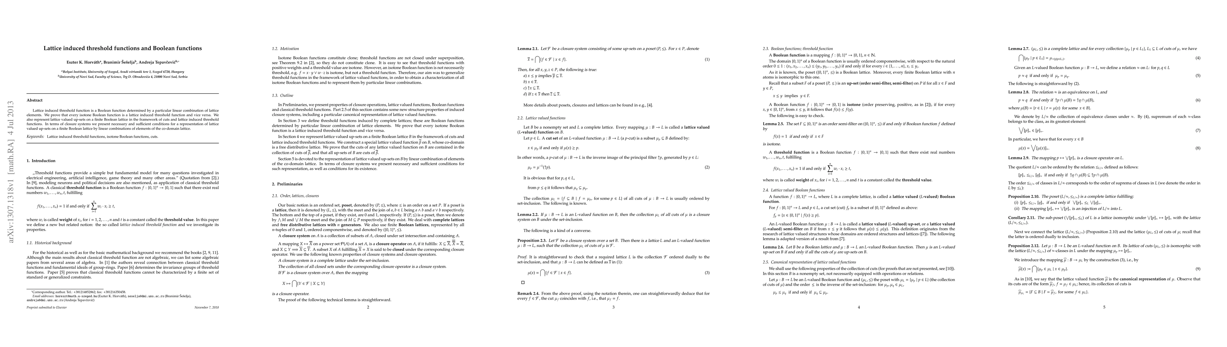 The paper establishes that every isotone Boolean function can be represented as a lattice induced threshold function and vice versa. It also explores the representation of lattice valued up-sets on finite Boolean lattices through cuts and linear combinations of co-domain lattice elements, providing necessary and sufficient conditions for such representations in terms of closure systems.