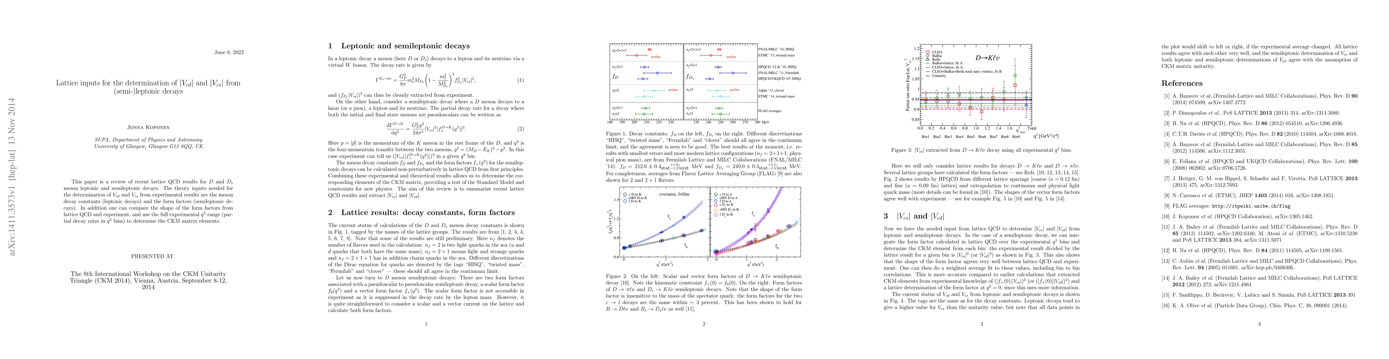 This paper reviews recent lattice QCD results for $D$ and $D_s$ meson decays, focusing on the determination of $V_{cd}$ and $V_{cs}$ using decay constants and form factors. It also compares lattice QCD predictions with experimental data to refine CKM matrix elements.