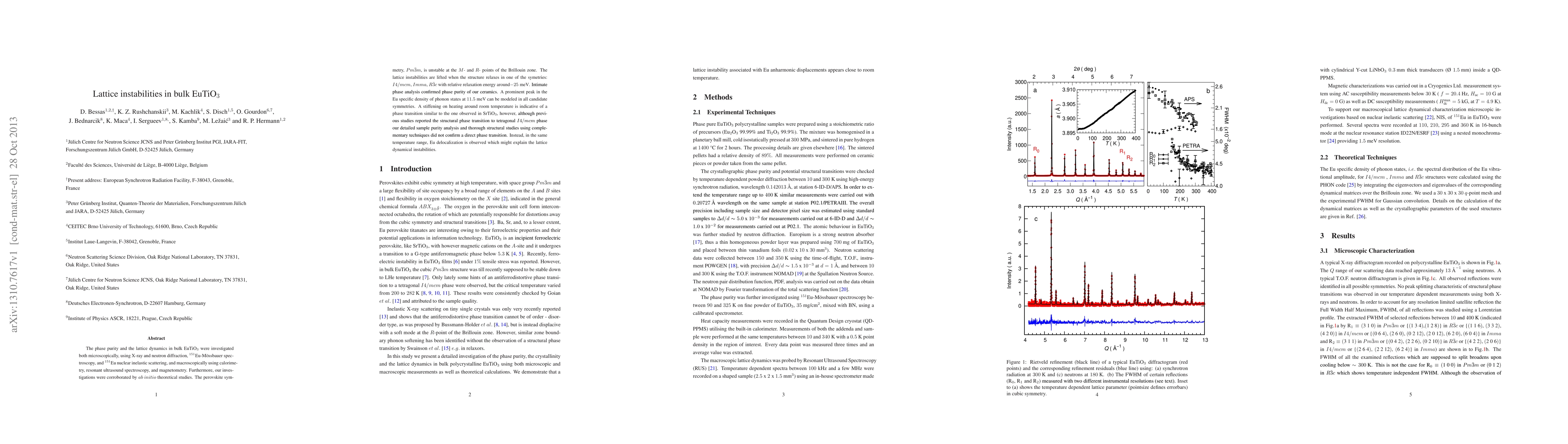 The phase purity and the lattice dynamics in bulk EuTiO3 were investigated both microscopically, using X-ray and neutron diffraction, 151-Eu-M\"ossbauer spectroscopy, and 151-Eu nuclear inelastic scattering, and macroscopically using calorimetry, resonant ultrasound spectroscopy, and magnetometry. Furthermore, our investigations were corroborated by ab initio theoretical studies. The perovskite symmetry, Pm-3m, is unstable at the M- and R- points of the Brillouin zone. The lattice instabilities are lifted when the structure relaxes in one of the symmetries: I4/mcm, Imma, R-3c with relative relaxation energy around -25 meV. Intimate phase analysis confirmed phase purity of our ceramics. A prominent peak in the Eu specific density of phonon states at 11.5 meV can be modelled in all candidate symmetries. A stiffening on heating around room temperature is indicative of a phase transition similar to the one observed in SrTiO3, however, although previous studies reported the structural phase transition to tetragonal I4/mcm phase our detailed sample purity analysis and thorough structural studies using complementary techniques did not confirm a direct phase transition. Instead, in the same temperature range, Eu delocalization is observed which might explain the lattice dynamical instabilities.