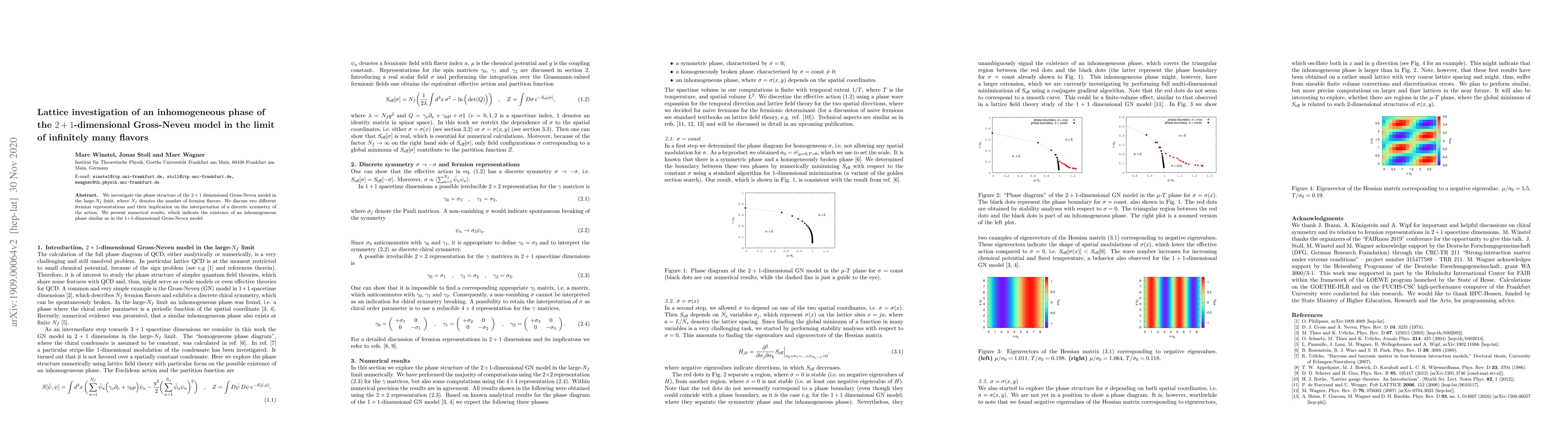 This study explores the phase structure of the 2+1-dimensional Gross-Neveu model with many fermion flavors, revealing an inhomogeneous phase akin to the 1+1-dimensional model. Numerical results highlight the implications of different fermion representations on the discrete symmetry of the action.