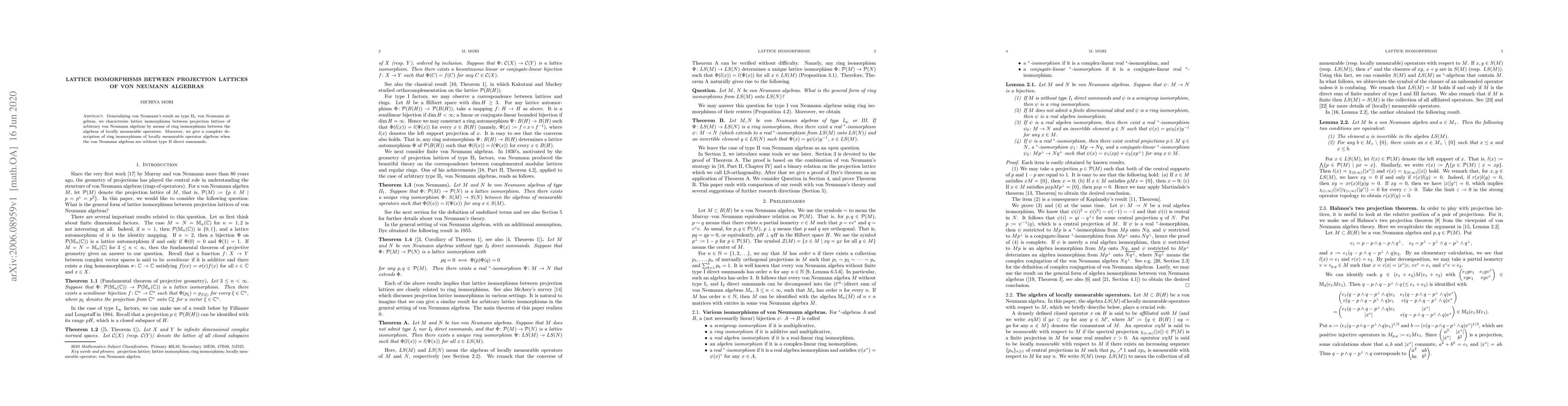 This paper generalizes von Neumann's result on type II$_1$ von Neumann algebras by identifying lattice isomorphisms between projection lattices of any von Neumann algebra through ring isomorphisms of locally measurable operators. It also provides a comprehensive description of ring isomorphisms for algebras without type II summands.