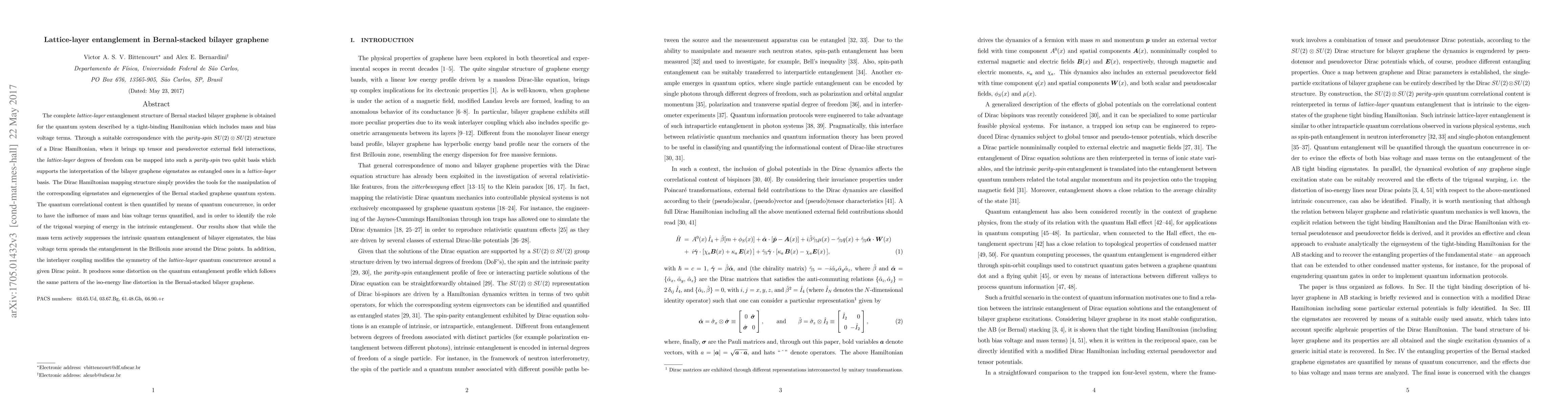 This paper investigates the lattice-layer entanglement in Bernal-stacked bilayer graphene using a tight-binding Hamiltonian and finds that the mass term suppresses entanglement while the bias voltage term spreads it. The study uses the Dirac Hamiltonian mapping to quantify quantum correlational content and reveals the impact of interlayer coupling on the symmetry of the entanglement profile.
