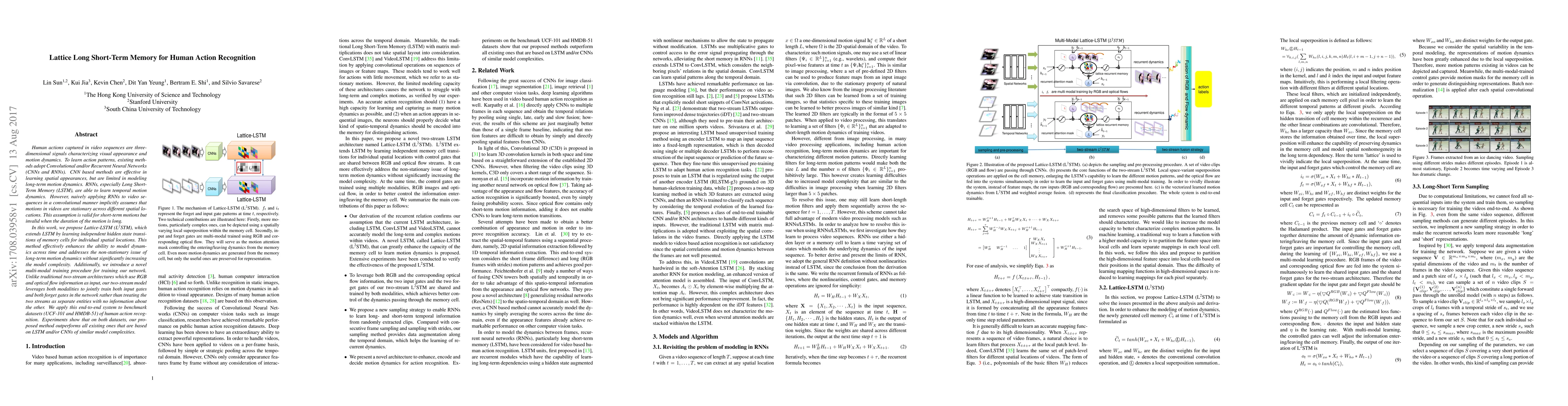 This paper proposes Lattice-LSTM (L2STM) to enhance human action recognition by modeling long-term motion dynamics across time more effectively. Unlike traditional RNNs, L2STM learns independent hidden state transitions for different spatial locations, addressing non-stationary long-term motion dynamics. The method also introduces a novel multi-modal training procedure that jointly trains both RGB and optical flow inputs, outperforming existing LSTM and CNN-based models on UCF-101 and HMDB-51 datasets.
