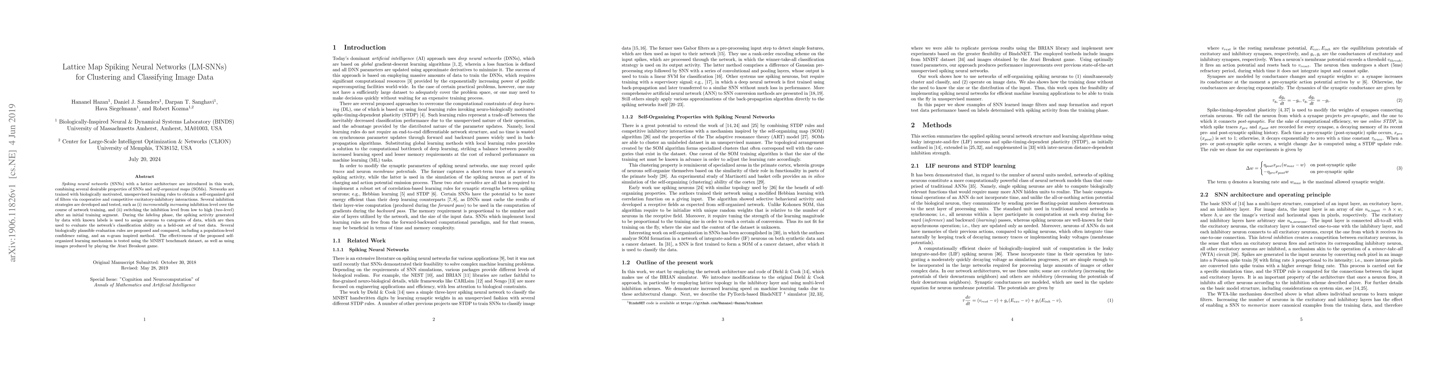 Spiking neural networks (SNNs) with a lattice architecture are introduced in this work, combining several desirable properties of SNNs and self-organized maps (SOMs). Networks are trained with biologically motivated, unsupervised learning rules to obtain a self-organized grid of filters via cooperative and competitive excitatory-inhibitory interactions. Several inhibition strategies are developed and tested, such as (i) incrementally increasing inhibition level over the course of network training, and (ii) switching the inhibition level from low to high (two-level) after an initial training segment. During the labeling phase, the spiking activity generated by data with known labels is used to assign neurons to categories of data, which are then used to evaluate the network's classification ability on a held-out set of test data. Several biologically plausible evaluation rules are proposed and compared, including a population-level confidence rating, and an $n$-gram inspired method. The effectiveness of the proposed self-organized learning mechanism is tested using the MNIST benchmark dataset, as well as using images produced by playing the Atari Breakout game.