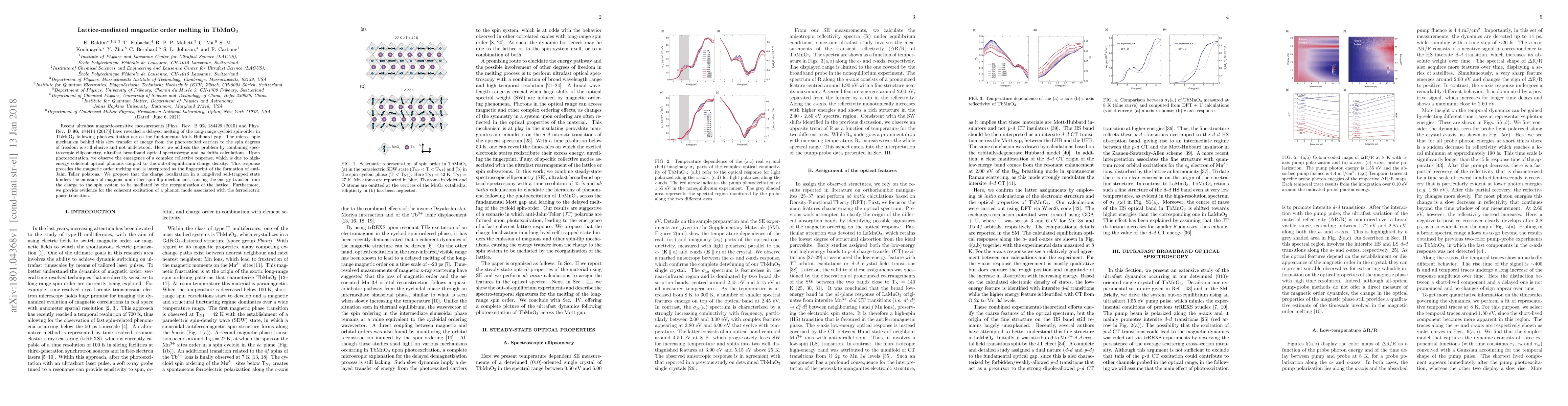 Recent ultrafast magnetic-sensitive measurements [Phys. Rev. B 92, 184429 (2015) and Phys. Rev. B 96, 184414 (2017)] have revealed a delayed melting of the long-range cycloid spin-order in TbMnO$_3$ following photoexcitation across the fundamental Mott-Hubbard gap. The microscopic mechanism behind this slow transfer of energy from the photoexcited carriers to the spin degrees of freedom is still elusive and not understood. Here, we address this problem by combining spectroscopic ellipsometry, ultrafast broadband optical spectroscopy and ab initio calculations. Upon photoexcitation, we observe the emergence of a complex collective response, which is due to high-energy coherent optical phonons coupled to the out-of-equilibrium charge density. This response precedes the magnetic order melting and is interpreted as the fingerprint of the formation of anti-Jahn Teller polarons. We propose that the charge localization in a long-lived self-trapped state hinders the emission of magnons and other spin-flip mechanisms, causing the energy transfer from the charge to the spin system to be mediated by the reorganization of the lattice. Furthermore, we provide evidence for the coherent excitation of a phonon mode associated with the ferroelectric phase transition.