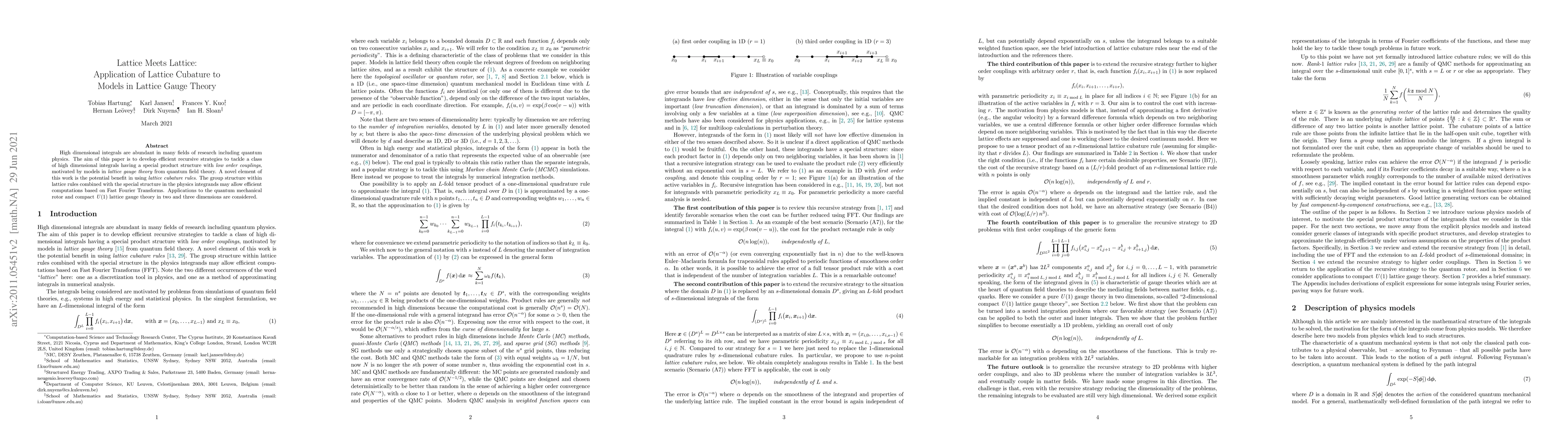 High dimensional integrals are abundant in many fields of research including quantum physics. The aim of this paper is to develop efficient recursive strategies to tackle a class of high dimensional integrals having a special product structure with low order couplings, motivated by models in lattice gauge theory from quantum field theory. A novel element of this work is the potential benefit in using lattice cubature rules. The group structure within lattice rules combined with the special structure in the physics integrands may allow efficient computations based on Fast Fourier Transforms. Applications to the quantum mechanical rotor and compact $U(1)$ lattice gauge theory in two and three dimensions are considered.