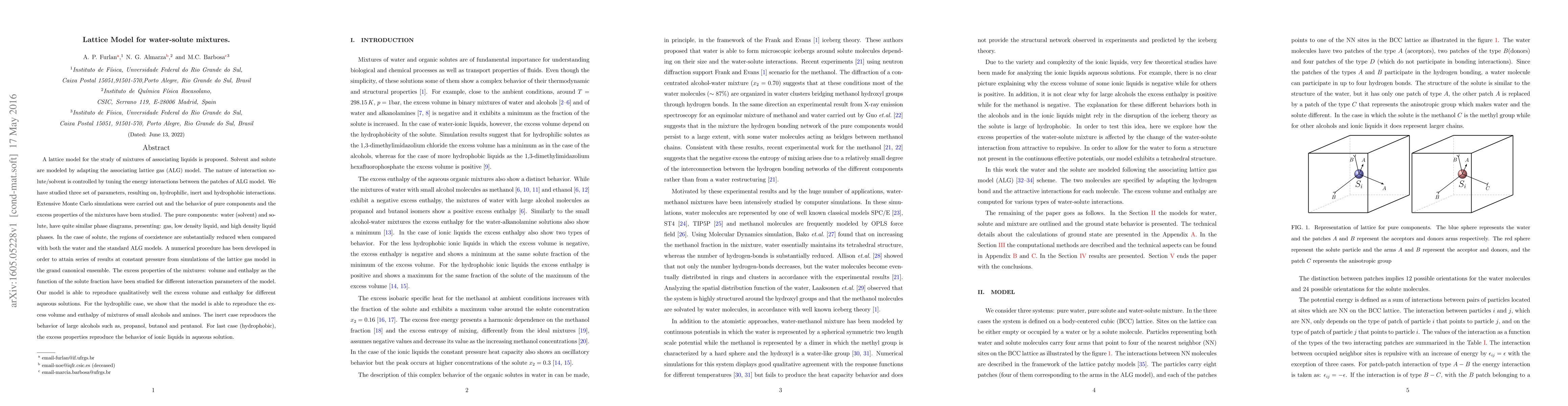 This paper proposes a lattice model to study water-solute mixtures using the associating lattice gas (ALG) model, simulating hydrophilic, inert, and hydrophobic interactions. Monte Carlo simulations reveal phase diagrams and excess properties, showing the model's ability to qualitatively reproduce the behavior of aqueous solutions, including small alcohols, large alcohols, and ionic liquids.