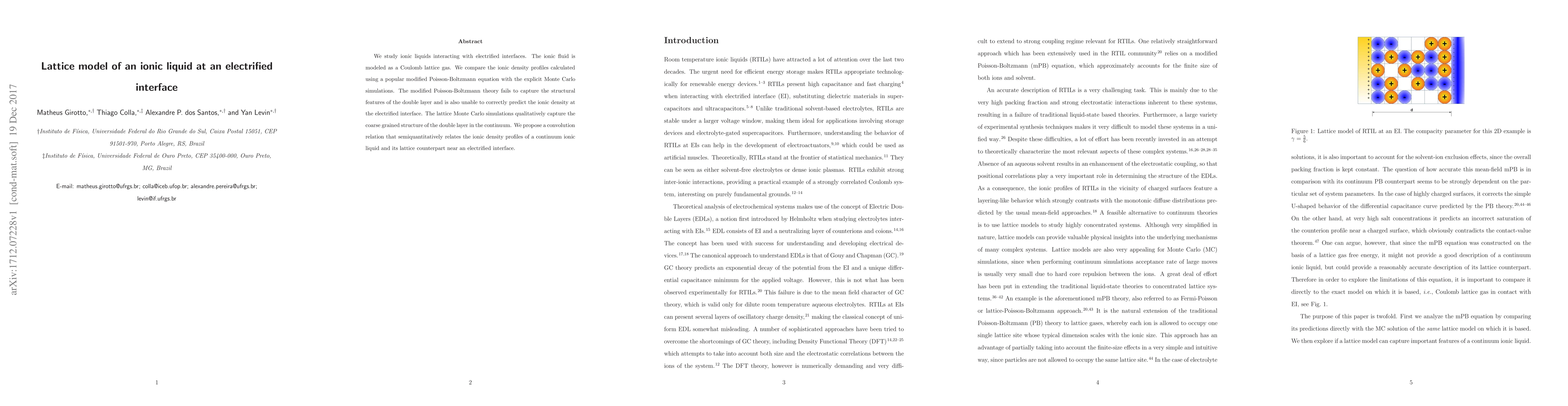 This paper investigates ionic liquids at electrified interfaces using a Coulomb lattice gas model and compares it with modified Poisson-Boltzmann theory. The study finds that the continuum theory fails to accurately predict ionic density profiles, while lattice Monte Carlo simulations provide a better qualitative match. The authors propose a convolution relation to relate continuum and lattice ionic density profiles.