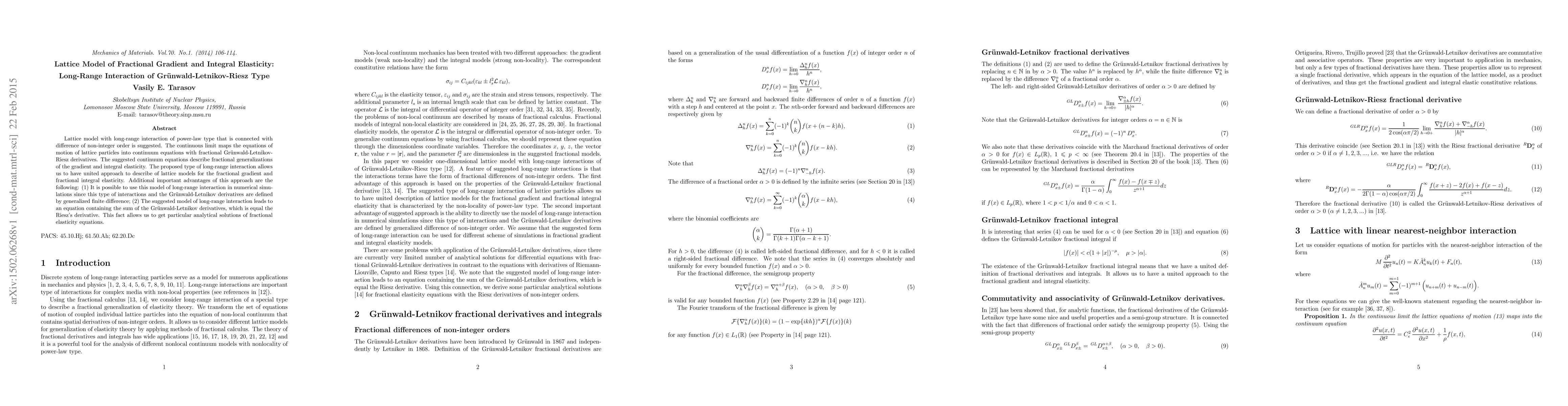 This paper proposes a lattice model with long-range interactions based on fractional derivatives of Grunwald-Letnikov-Riesz type, which generalizes gradient and integral elasticity. The model facilitates numerical simulations and provides analytical solutions for fractional elasticity equations.