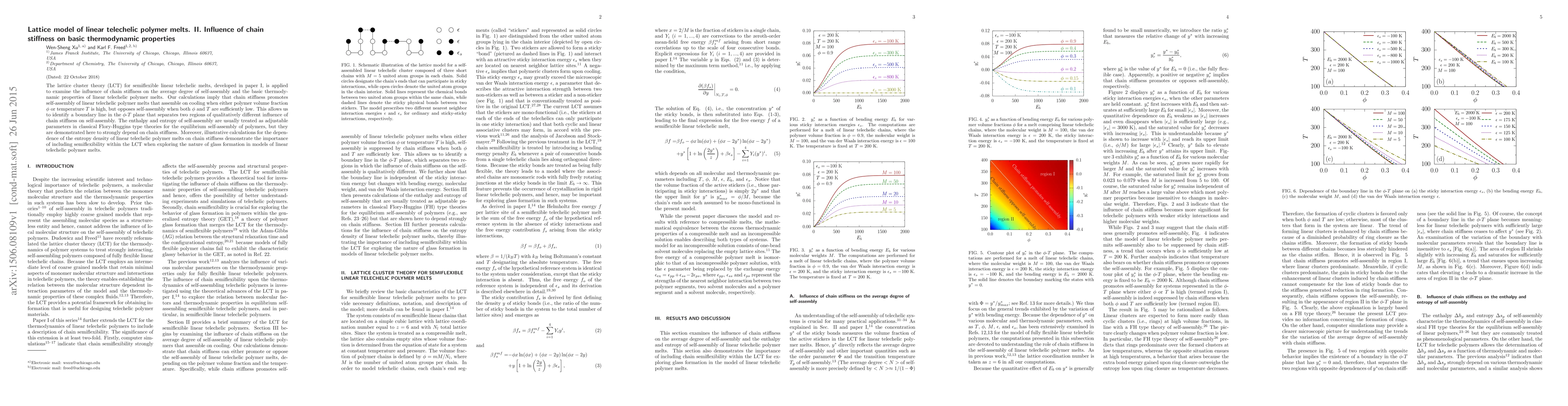 The lattice cluster theory (LCT) for semiflexible linear telechelic melts, developed in paper I, is applied to examine the influence of chain stiffness on the average degree of self-assembly and the basic thermodynamic properties of linear telechelic polymer melts. Our calculations imply that chain stiffness promotes self-assembly of linear telechelic polymer melts that assemble on cooling when either polymer volume fraction $\phi$ or temperature $T$ is high, but opposes self-assembly when both $\phi$ and $T$ are sufficiently low. This allows us to identify a boundary line in the $\phi$-$T$ plane that separates two regions of qualitatively different influence of chain stiffness on self-assembly. The enthalpy and entropy of self-assembly are usually treated as adjustable parameters in classical Flory-Huggins type theories for the equilibrium self-assembly of polymers, but they are demonstrated here to strongly depend on chain stiffness. Moreover, illustrative calculations for the dependence of the entropy density of linear telechelic polymer melts on chain stiffness demonstrate the importance of including semiflexibility within the LCT when exploring the nature of glass formation in models of linear telechelic polymer melts.