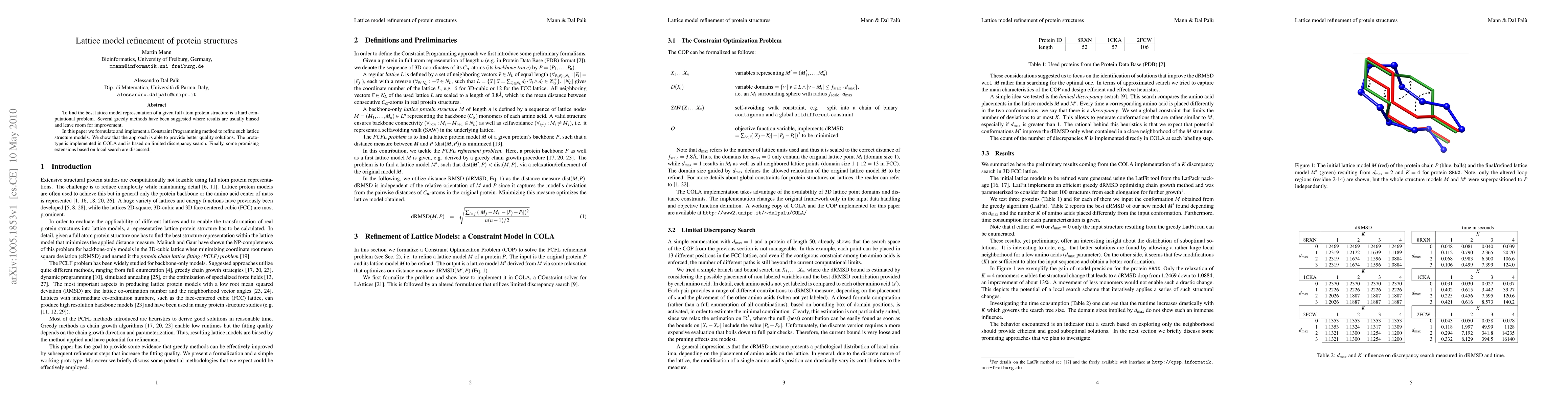 To find the best lattice model representation of a given full atom protein structure is a hard computational problem. Several greedy methods have been suggested where results are usually biased and leave room for improvement. In this paper we formulate and implement a Constraint Programming method to refine such lattice structure models. We show that the approach is able to provide better quality solutions. The prototype is implemented in COLA and is based on limited discrepancy search. Finally, some promising extensions based on local search are discussed.