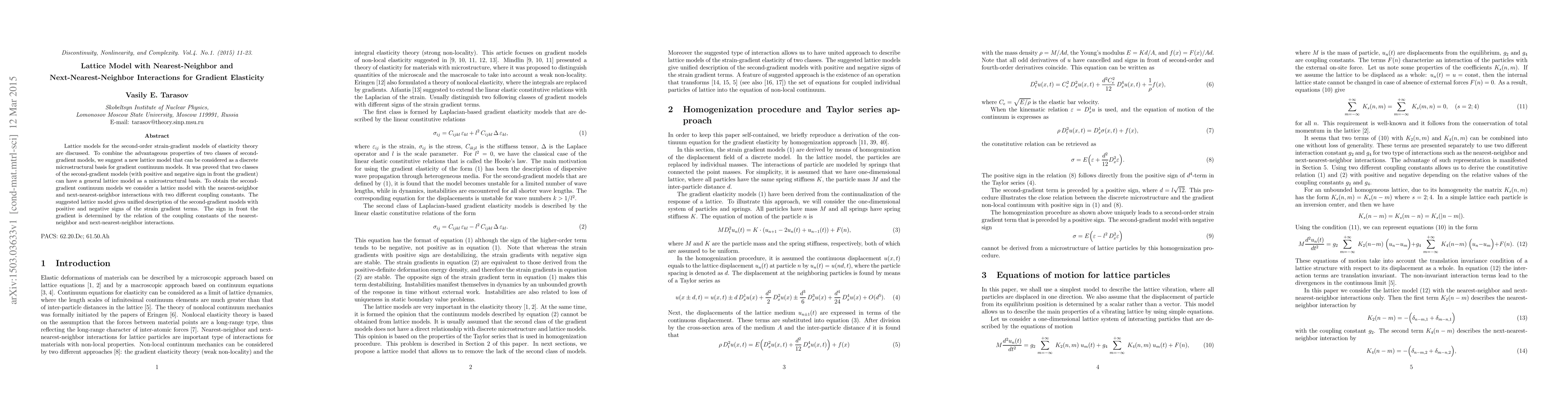 The paper proposes a lattice model combining nearest-neighbor and next-nearest-neighbor interactions to represent second-order strain-gradient models in elasticity theory. This model provides a unified microstructural basis for both positive and negative gradient terms in continuum models, with the sign determined by the ratio of interaction constants.