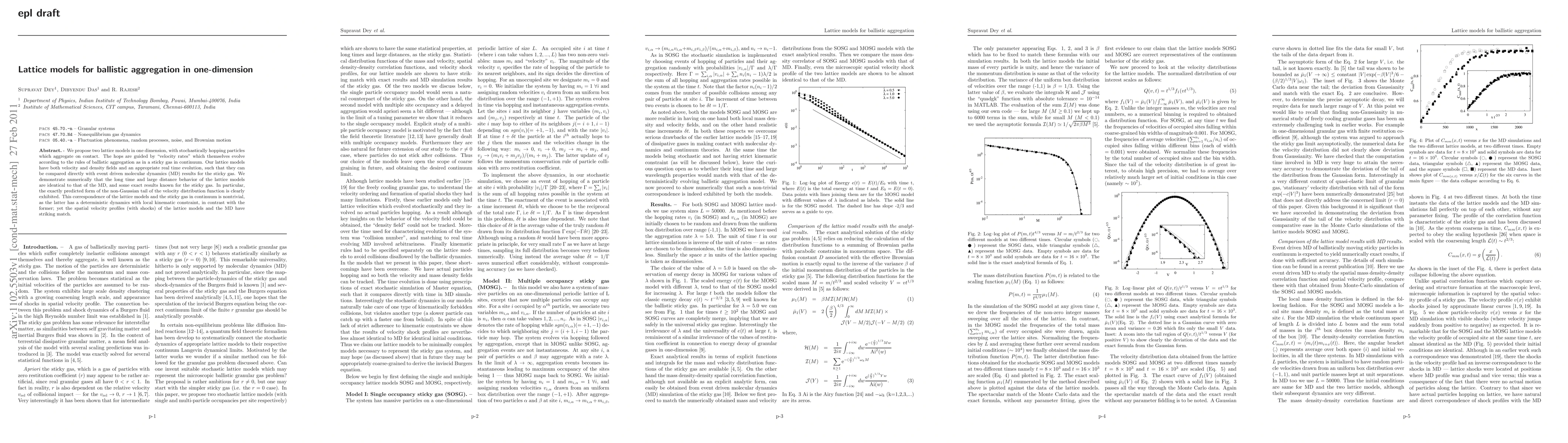 This paper proposes two one-dimensional lattice models for ballistic aggregation, where particles aggregate upon contact and hop with evolving "velocity rates." The models' long-time and large-distance behavior matches that of event-driven molecular dynamics simulations for a sticky gas, demonstrating the exact form of the non-Gaussian tail in the velocity distribution function.