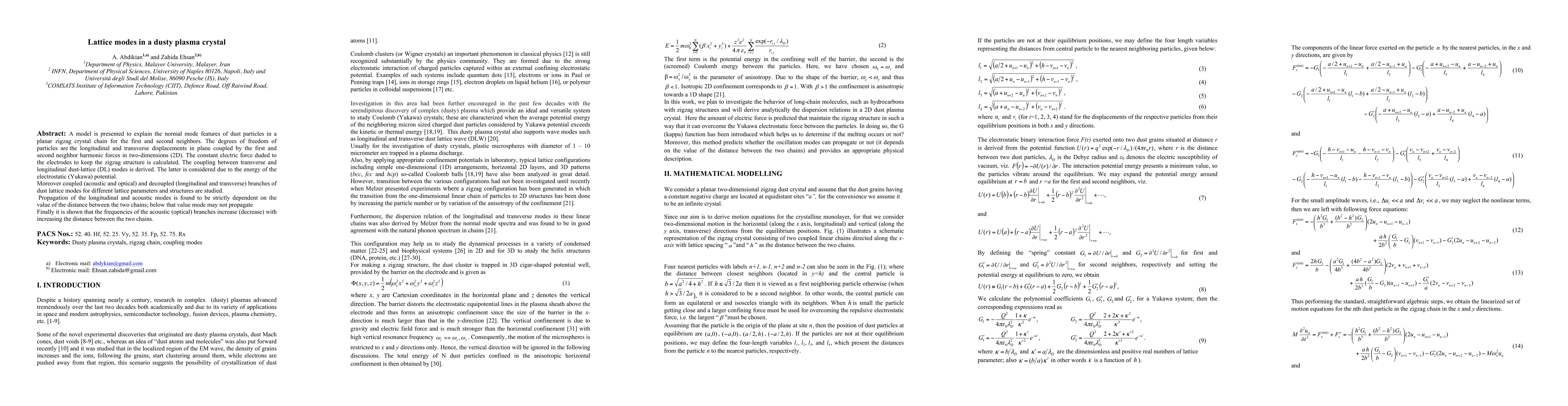 A model is presented to explain the normal mode features of dust particles in a planar zigzag crystal chain for the first and second neighbors. The degrees of freedom of particles are the longitudinal and transverse displacements in plane coupled by the first and second neighbor harmonic forces in two-dimensions (2D). The constant electric force duded to the electrodes to keep the zigzag structure is calculated. The coupling between transverse and longitudinal dust-lattice (DL) modes is derived. The latter is considered due to the energy of the electrostatic (Yukawa) potential. Moreover coupled (acoustic and optical) and decoupled (longitudinal and transverse) branches of dust lattice modes for different lattice parameters and structures are studied. Propagation of the longitudinal and acoustic modes is found to be strictly dependent on the value of the distance between the two chains; below that value mode may not propagate Finally it is shown that the frequencies of the acoustic (optical) branches increase (decrease) with increasing the distance between the two chains.