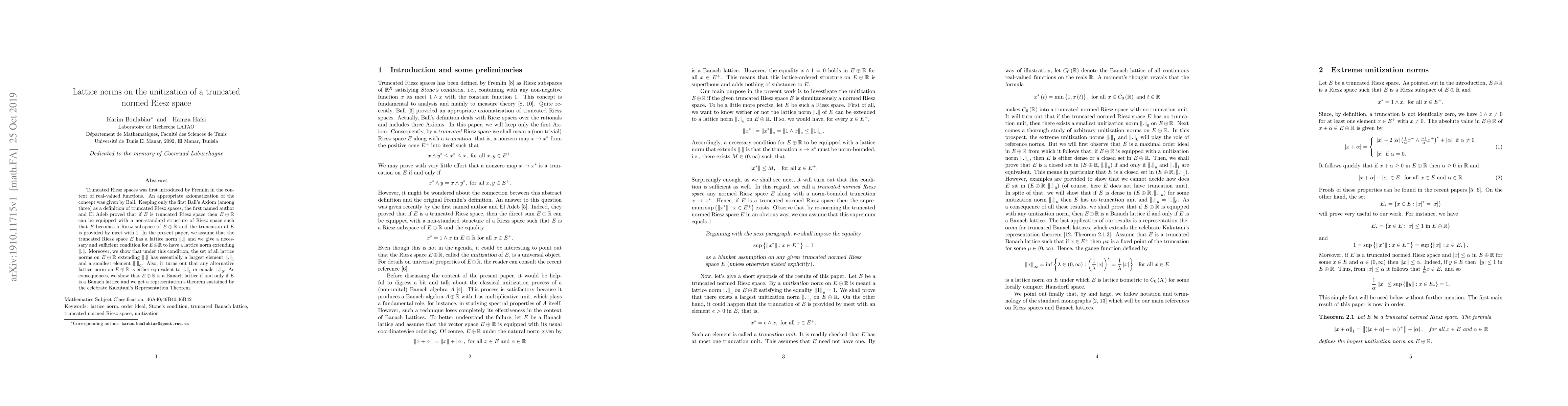 Truncated Riesz spaces was first introduced by Fremlin in the context of real-valued functions. An appropriate axiomatization of the concept was given by Ball. Keeping only the first Ball's Axiom (among three) as a definition of truncated Riesz spaces, the first named author and El Adeb proved that if $E$ is truncated Riesz space then $E\oplus\mathbb{R}$ can be equipped with a non-standard structure of Riesz space such that $E$ becomes a Riesz subspace of $E\oplus\mathbb{R}$ and the truncation of $E$ is provided by meet with $1$. In the present paper, we assume that the truncated Riesz space $E$ has a lattice norm $\left\Vert .\right\Vert $ and we give a necessary and sufficient condition for $E\oplus\mathbb{R}$ to have a lattice norm extending $\left\Vert .\right\Vert $. Moreover, we show that under this condition, the set of all lattice norms on $E\oplus\mathbb{R}$ extending $\left\Vert .\right\Vert $ has essentially a largest element $\left\Vert .\right\Vert _{1}$ and a smallest element $\left\Vert .\right\Vert _{0}$. Also, it turns out that any alternative lattice norm on $E\oplus\mathbb{R}$ is either equivalent to $\left\Vert .\right\Vert _{1}$ or equals $\left\Vert .\right\Vert _{0}$. As consequences, we show that $E\oplus\mathbb{R}$ is a Banach lattice if and only if $E$ is a Banach lattice and we get a representation's theorem sustained by the celebrate Kakutani's Representation Theorem.