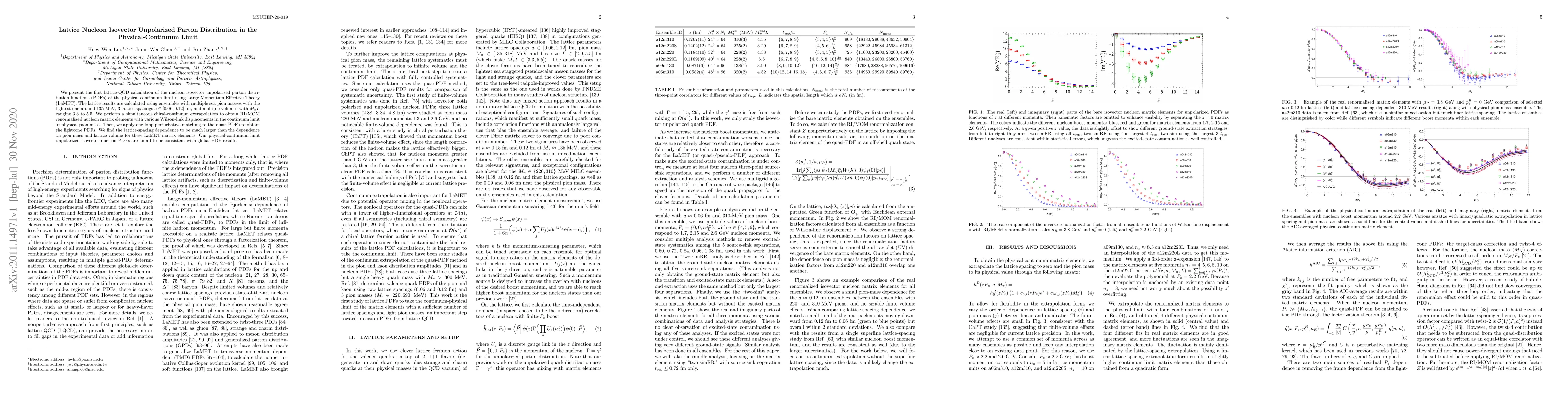 This paper reports the first lattice-QCD calculation of nucleon isovector unpolarized parton distribution functions (PDFs) in the physical-continuum limit using LaMET. The results show consistency with global-PDF results, highlighting significant lattice-spacing dependence.