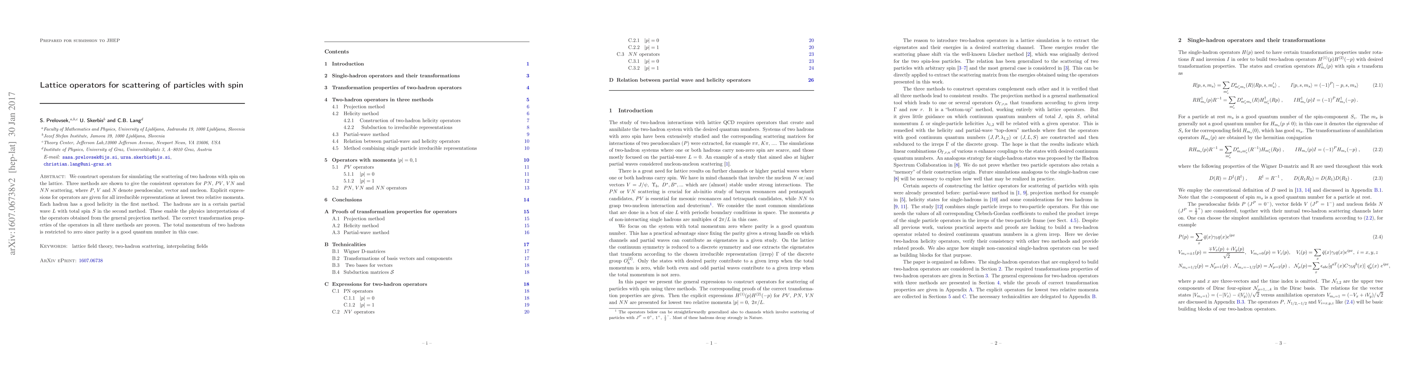 We construct operators for simulating the scattering of two hadrons with spin on the lattice. Three methods are shown to give the consistent operators for PN, PV, VN and NN scattering, where P, V and N denote pseudoscalar, vector and nucleon. Explicit expressions for operators are given for all irreducible representations at lowest two relative momenta. Each hadron has a good helicity in the first method. The hadrons are in a certain partial wave L with total spin S in the second method. These enable the physics interpretations of the operators obtained from the general projection method. The correct transformation properties of the operators in all three methods are proven. The total momentum of two hadrons is restricted to zero since parity is a good quantum number in this case.