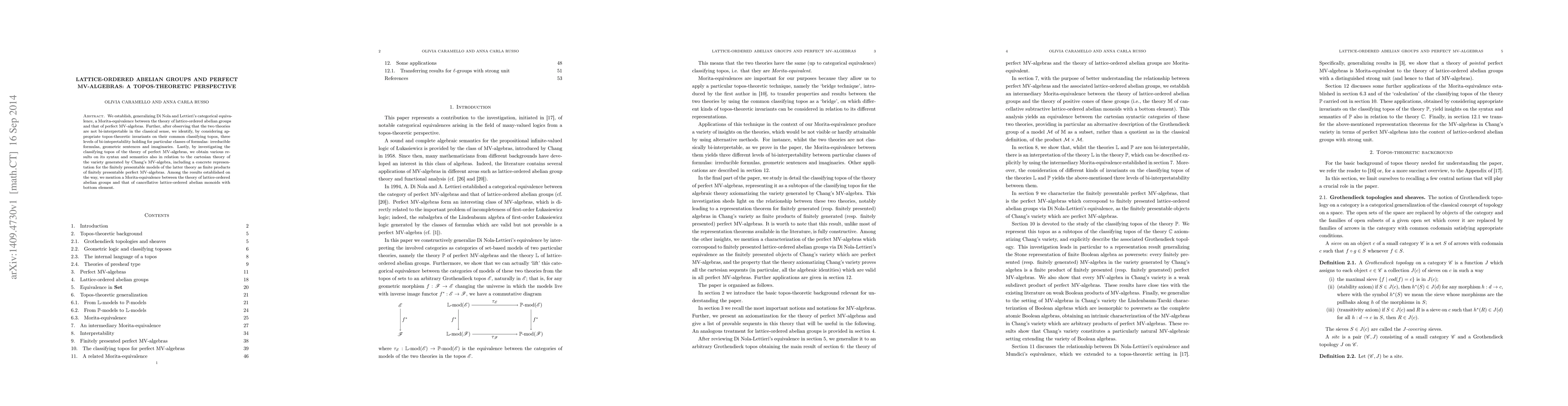 This paper establishes a Morita-equivalence between lattice-ordered abelian groups and perfect MV-algebras via topos theory, identifying levels of bi-interpretability for specific formula classes, and providing a representation for finitely presentable models of MV-algebras. Additionally, it reveals a Morita-equivalence between lattice-ordered abelian groups and cancellative lattice-ordered abelian monoids with a bottom element.