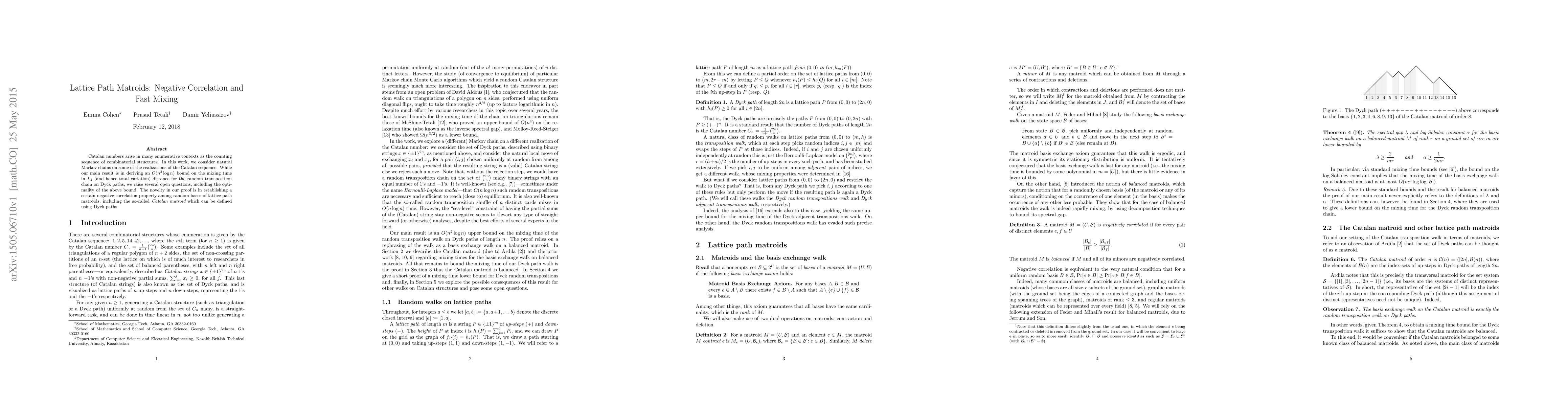 Catalan numbers arise in many enumerative contexts as the counting sequence of combinatorial structures. In this work, we consider natural Markov chains on some of the realizations of the Catalan sequence. While our main result is in deriving an $O(n^2 \log n)$ bound on the mixing time in $L_2$ (and hence total variation) distance for the random transposition chain on Dyck paths, we raise several open questions, including the optimality of the above bound. The novelty in our proof is in establishing a certain negative correlation property among random bases of lattice path matroids, including the so-called Catalan matroid which can be defined using Dyck paths.