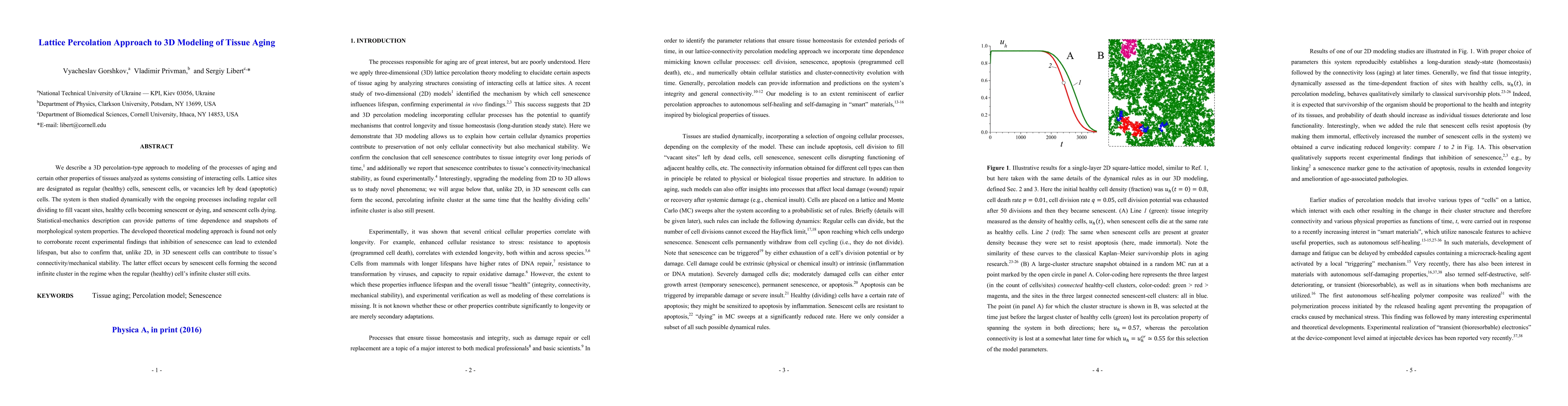 We describe a 3D percolation-type approach to modeling of the processes of aging and certain other properties of tissues analyzed as systems consisting of interacting cells. Lattice sites are designated as regular (healthy) cells, senescent cells, or vacancies left by dead (apoptotic) cells. The system is then studied dynamically with the ongoing processes including regular cell dividing to fill vacant sites, healthy cells becoming senescent or dying, and senescent cells dying. Statistical-mechanics description can provide patterns of time dependence and snapshots of morphological system properties. The developed theoretical modeling approach is found not only to corroborate recent experimental findings that inhibition of senescence can lead to extended lifespan, but also to confirm that, unlike 2D, in 3D senescent cells can contribute to tissue's connectivity/mechanical stability. The latter effect occurs by senescent cells forming the second infinite cluster in the regime when the regular (healthy) cell's infinite cluster still exits.