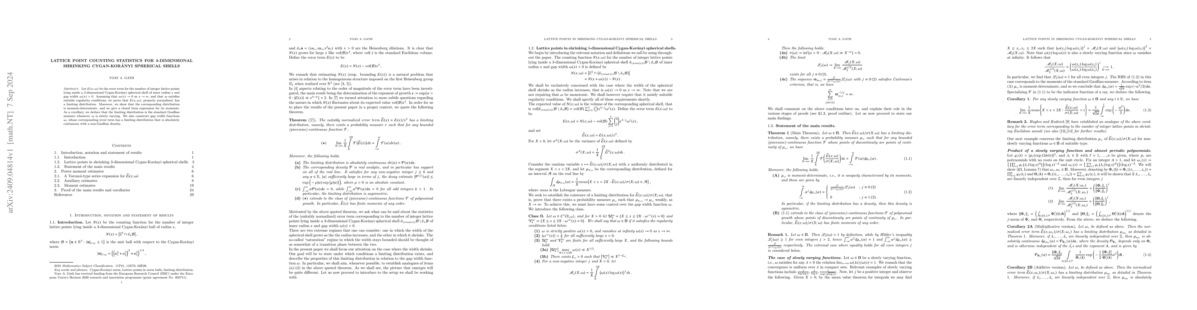 This paper studies the error term in counting lattice points within shrinking Cygan-Korányi spherical shells in 3D and demonstrates that, under suitable conditions, this error term converges to a standard Gaussian distribution. It also presents non-Gaussian limiting distributions for specific gap width functions.
