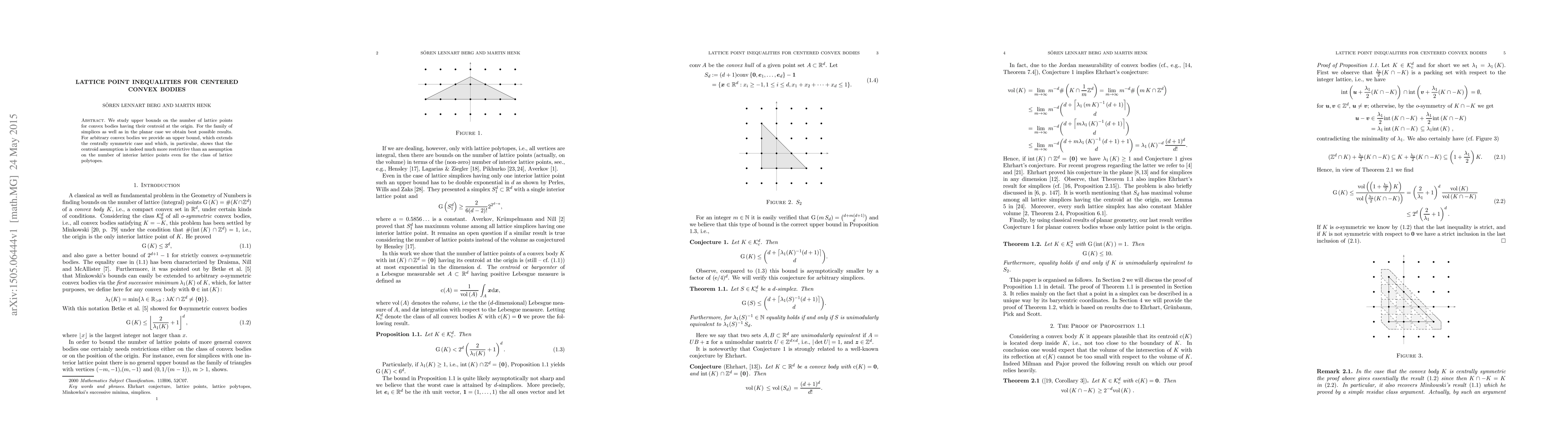 This paper investigates upper bounds on the number of lattice points for centered convex bodies, achieving optimal results for simplices and planar cases. It extends these bounds to arbitrary convex bodies, demonstrating that centering at the origin significantly restricts the lattice point count compared to general interior lattice points.