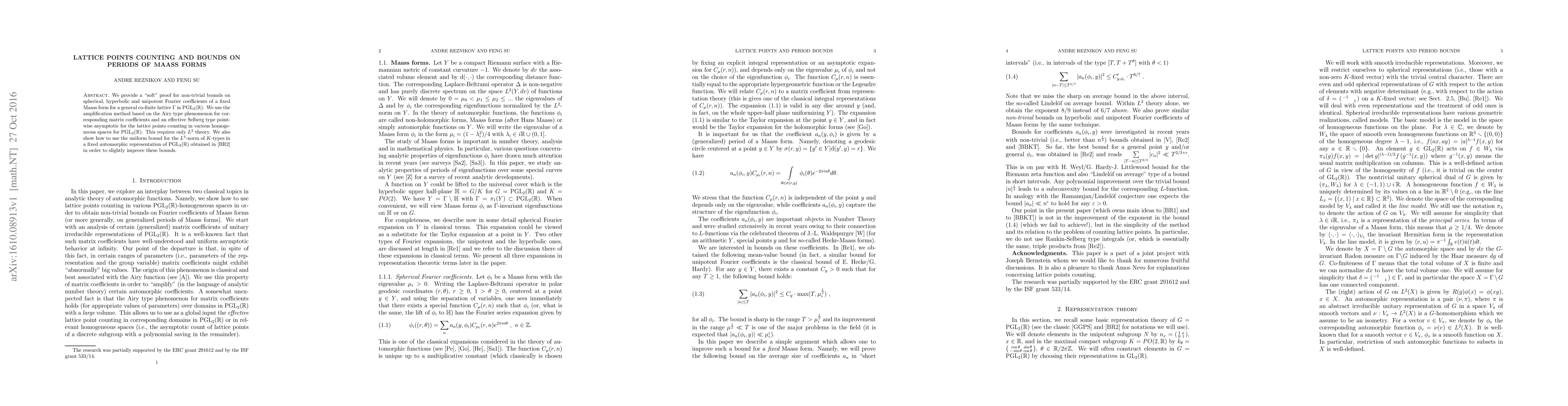 We provide a "soft" proof for non-trivial bounds on spherical, hyperbolic and unipotent Fourier coefficients of a fixed Maass form for a general co-finite lattice $\Gamma$ in $PGL(2,R)$. We use the amplification method based on the Airy type phenomenon for corresponding matrix coefficients and an effective Selberg type pointwise asymptotic for the lattice points counting in various homogeneous spaces for $PGL(2,R)$.