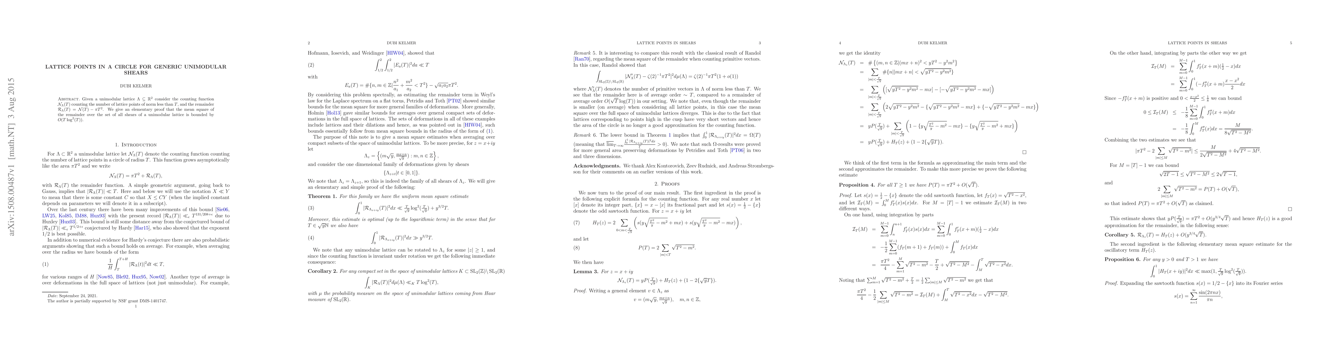 Given a unimodular lattice $\Lambda\subseteq \mathbb{R}^2$ consider the counting function $\mathcal{N}_\Lambda(T)$ counting the number of lattice points of norm less than $T$, and the remainder $\mathcal{R}_\Lambda(T)=\mathcal{N}(T)-\pi T^2$. We give an elementary proof that the mean square of the remainder over the set of all shears of a unimodular lattice is bounded by $O(T\log^2(T))$.