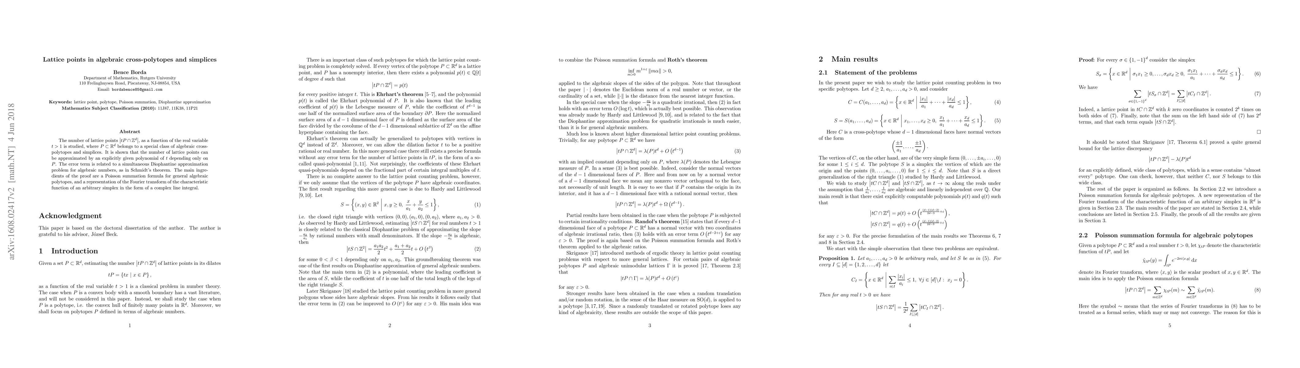 The paper studies lattice points in algebraic cross-polytopes and simplices, finding that their number can be approximated by a polynomial of the form $t^n$ where n depends on P. The error term is related to a Diophantine approximation problem.